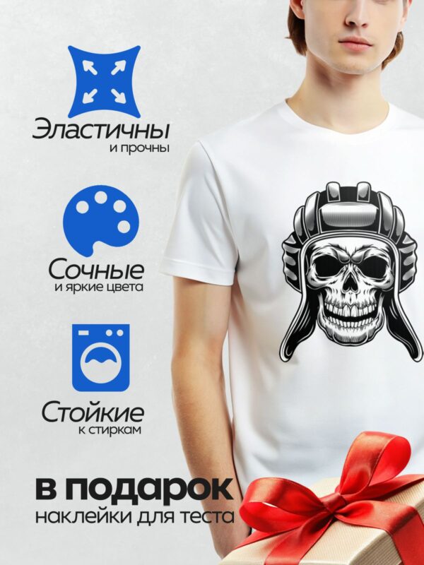 Термонаклейка на одежду DTF / Череп в танковом шлемофоне, стилизованный под гравюру.