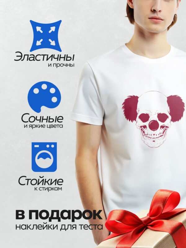 Термонаклейка на одежду DTF / Череп клоуна с красным носом и пушистыми ушами.
