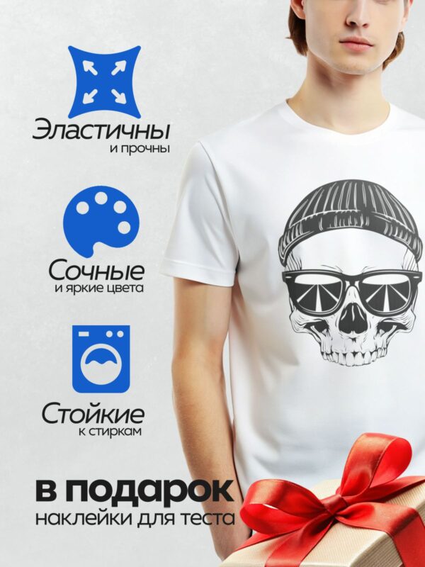 Термонаклейка на одежду DTF / Череп в шапке и очках, стилизованный рисунок.