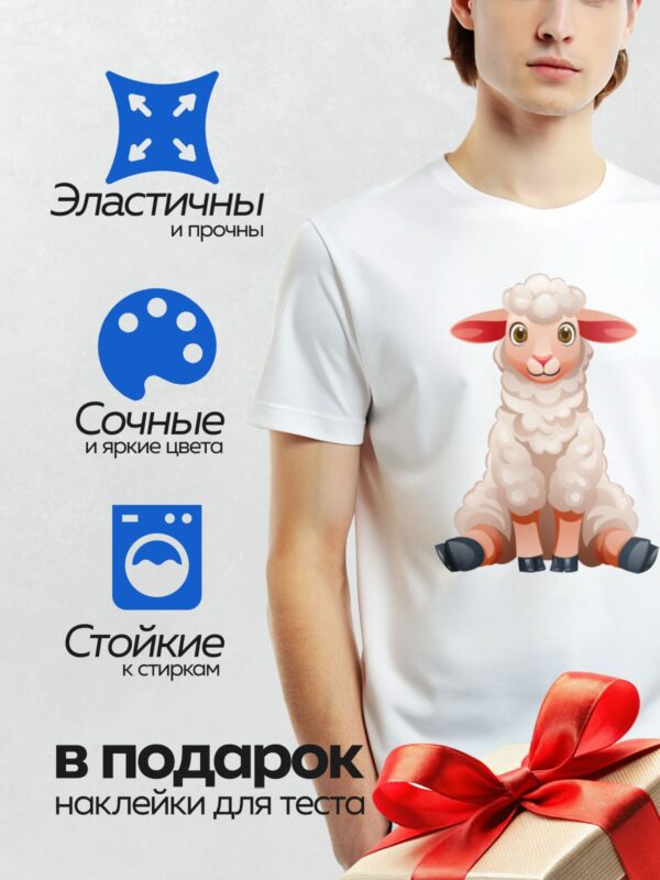 Термонаклейка на одежду DTF / Мультяшная овечка с пушистой шерстью и добрыми глазами.
