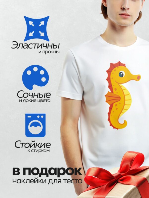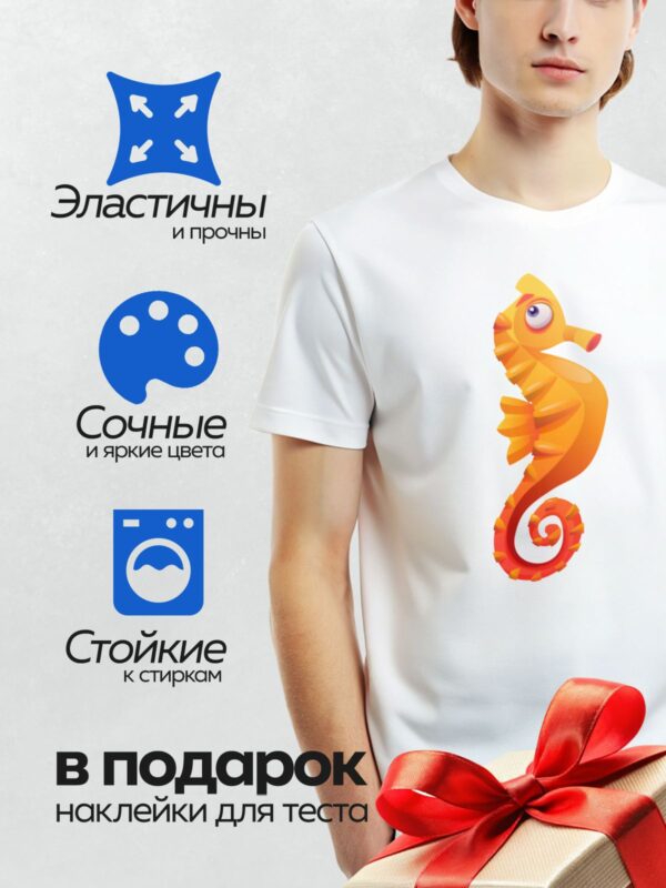 Термонаклейка на одежду DTF / Мультяшный морской конёк с яркими цветами и большими глазами.