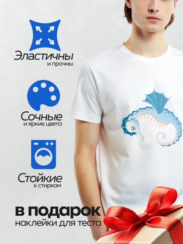 Термонаклейка на одежду DTF / Мультяшный морской конёк с голубым телом и жёлтыми плавниками.