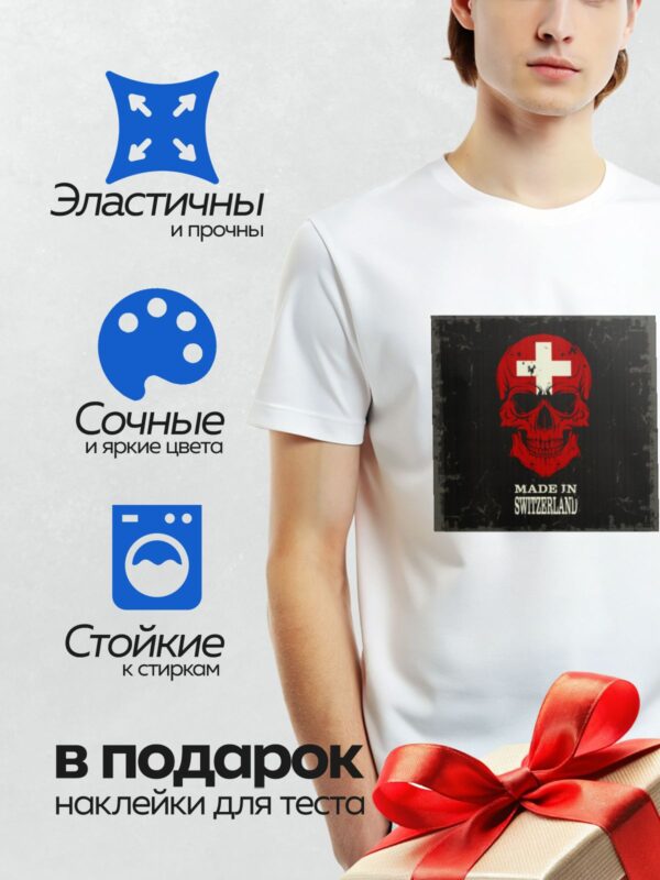 Термонаклейка на одежду DTF / Красный череп с флагом Швейцарии и надписью “Made in Switzerland”.