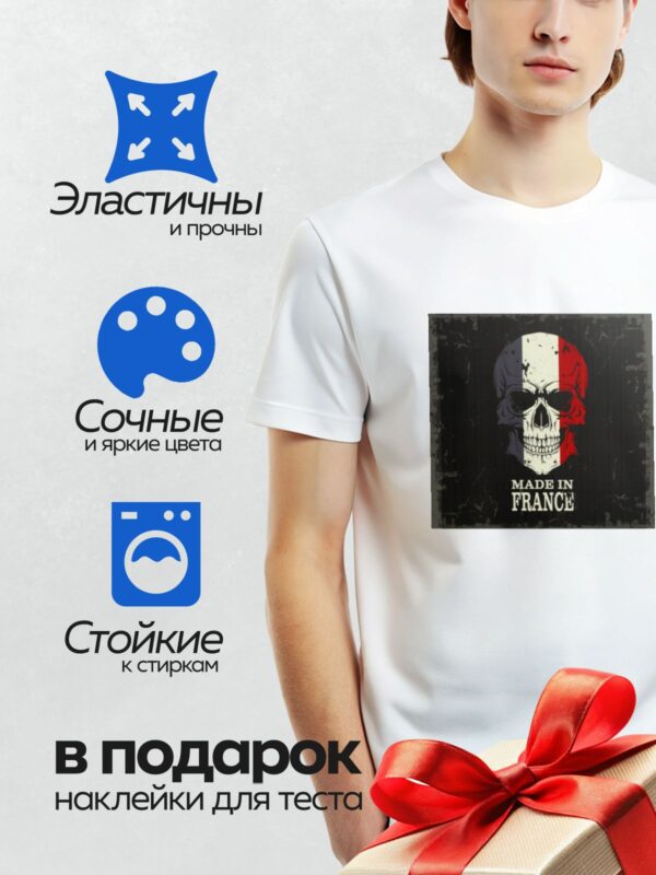 Термонаклейка на одежду DTF / Череп в цветах французского флага с надписью “Made in France”.
