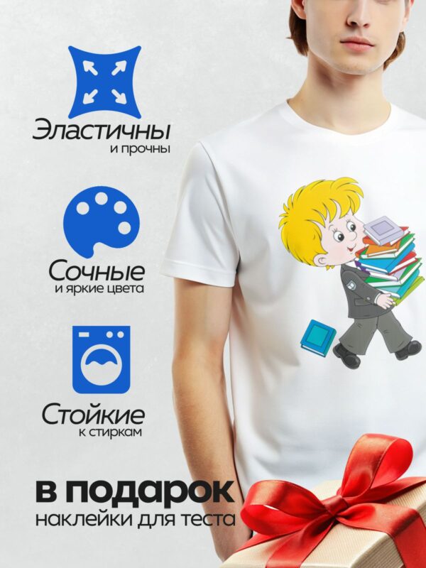 Термонаклейка на одежду DTF / Мальчик-школьник с яркими волосами несет стопку книг.