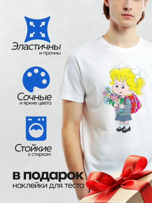 Термонаклейка на одежду DTF / Девочка в школьной форме с букетом цветов и рюкзаком.