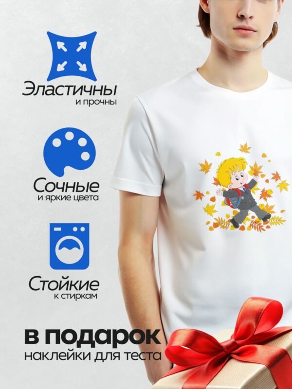 Термонаклейка на одежду DTF / Мальчик-школьник играет с осенними листьями.