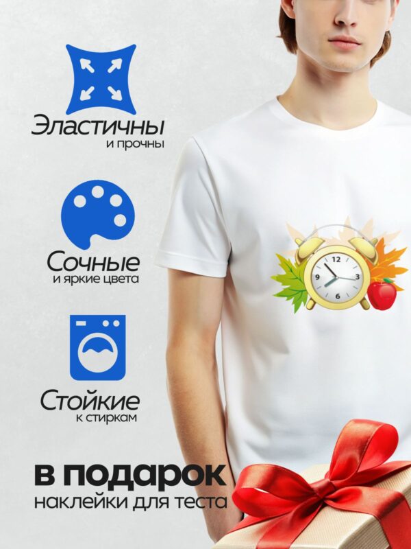 Термонаклейка на одежду DTF / Будильник, осенние листья, красное яблоко, яркий фон.