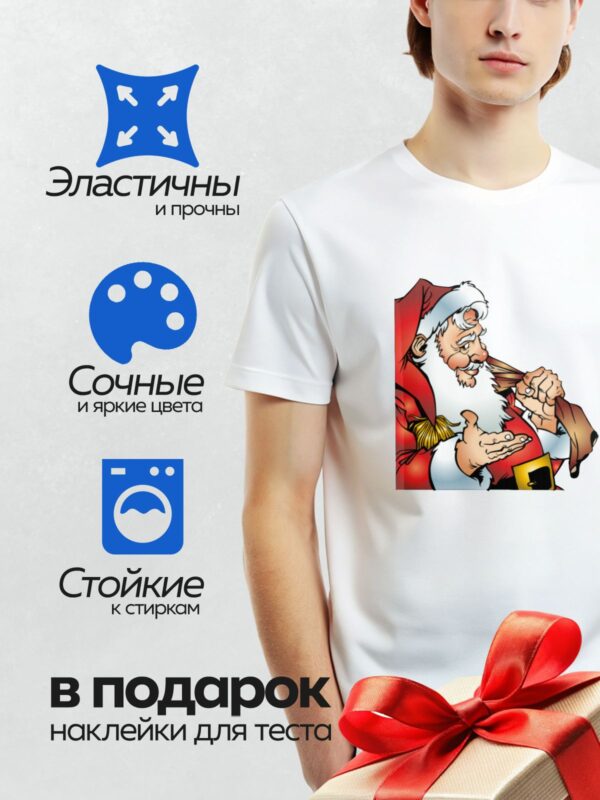 Термонаклейка на одежду DTF / Мультяшный Дед Мороз с мешком подарков и белой бородой.