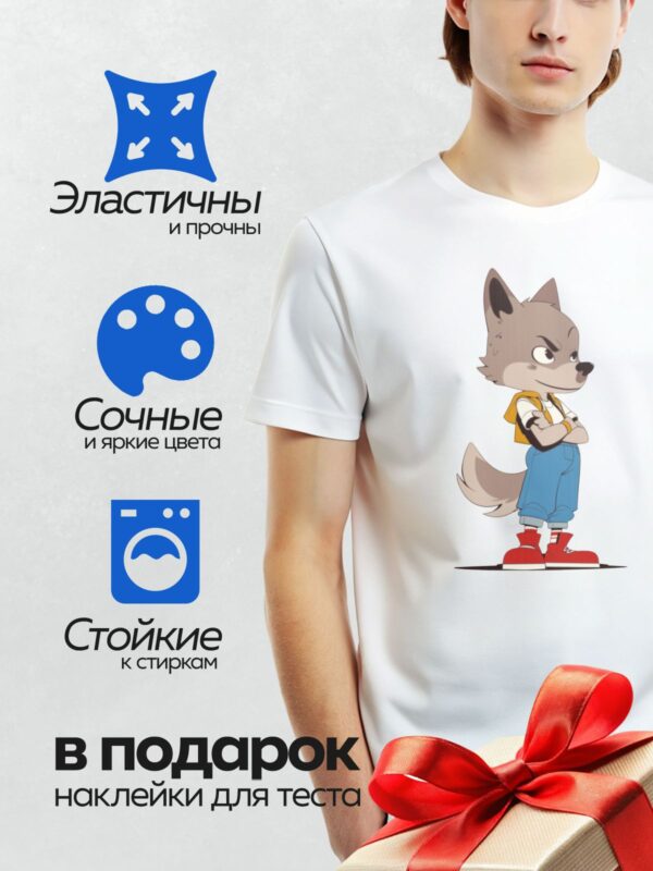 Термонаклейка на одежду DTF / Мультяшный волк в яркой одежде и красных ботинках.
