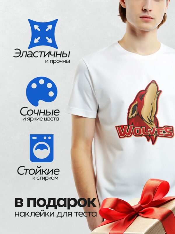 Термонаклейка на одежду DTF / Стилизованный красный волк с надписью “WOLVES”.