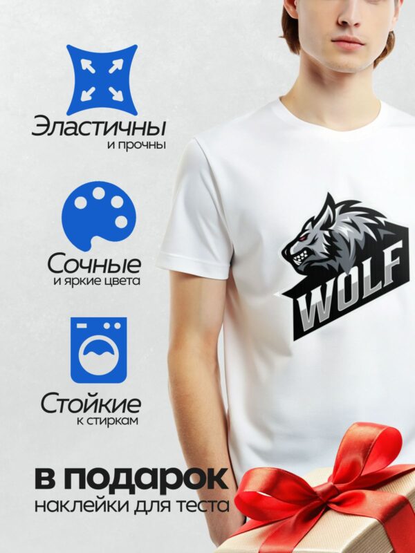 Термонаклейка на одежду DTF / Стилизованный волк с надписью “WOLF” в динамичном дизайне.