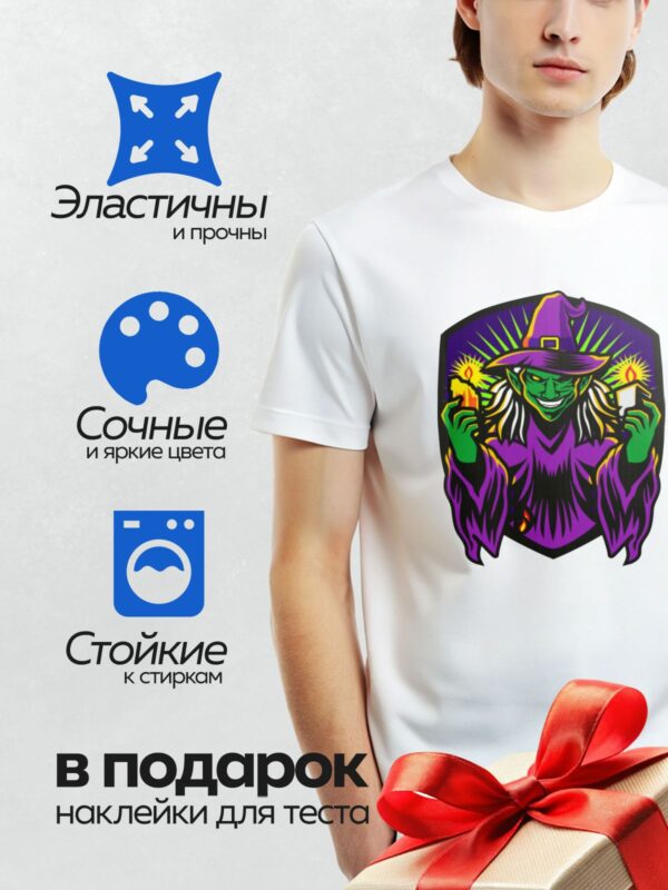 Термонаклейка на одежду DTF / Ведьма с зелёной кожей держит две свечи.