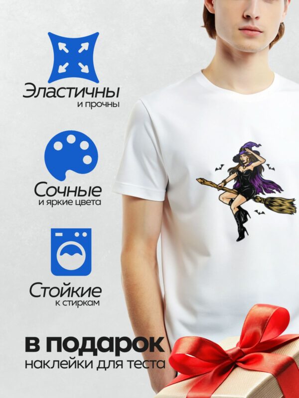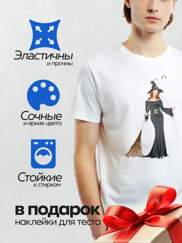 Термонаклейка на одежду DTF / Женщина в черном платье, с метлой и шляпой ведьмы.