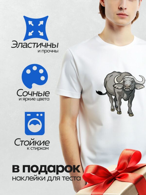 Термонаклейка на одежду DTF / Мультяшный буйвол с большими рогами и ушами.