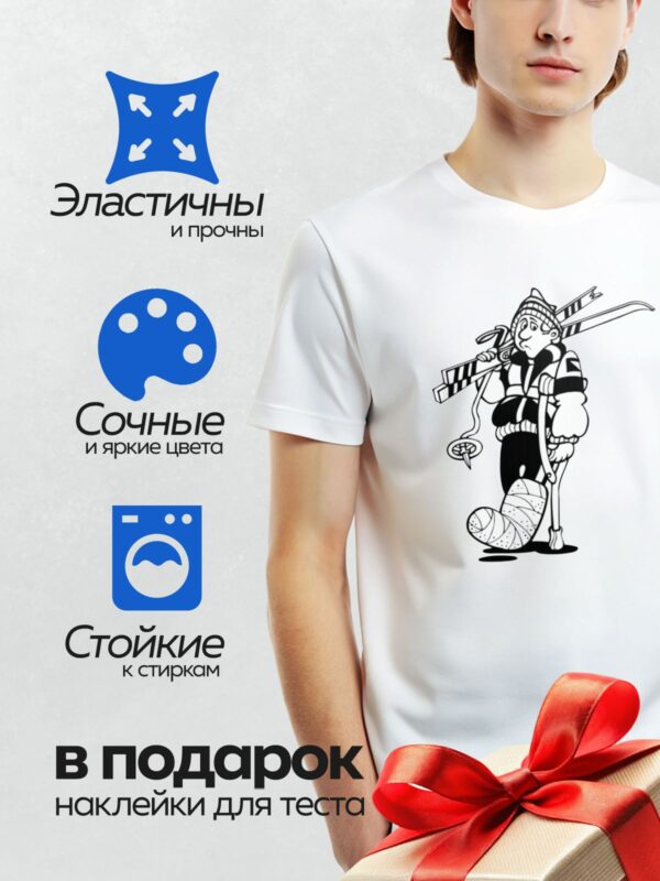 Термонаклейка на одежду DTF / Лыжник с загипсованной ногой и лыжами в руках.