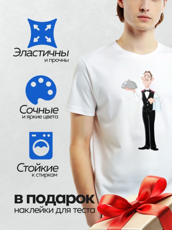 Термонаклейка на одежду DTF / Мультяшный официант с подносом и салфеткой.