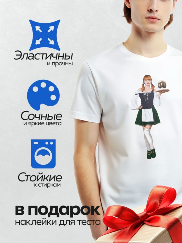Термонаклейка на одежду DTF / Мультяшная официантка в баварском костюме с подносом пива.