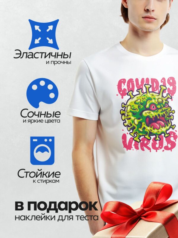 Термонаклейка на одежду DTF / Мультяшный вирус с лицом и надписью “COVID-19 VIRUS”.