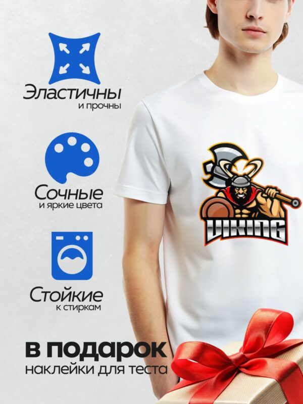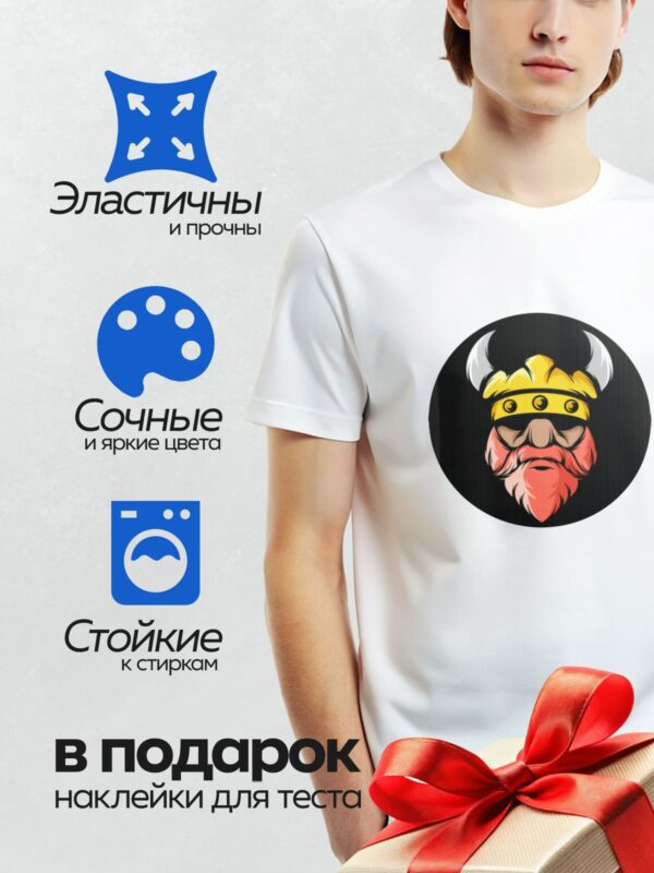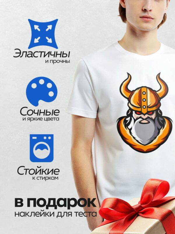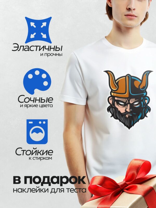Термонаклейка на одежду DTF / Мультяшный викинг с рогами, топором и щитом.