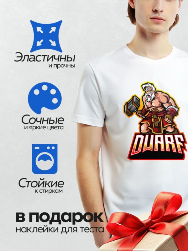 Термонаклейка на одежду DTF / Мультяшный дворф с молотом и надписью “DWARF”.