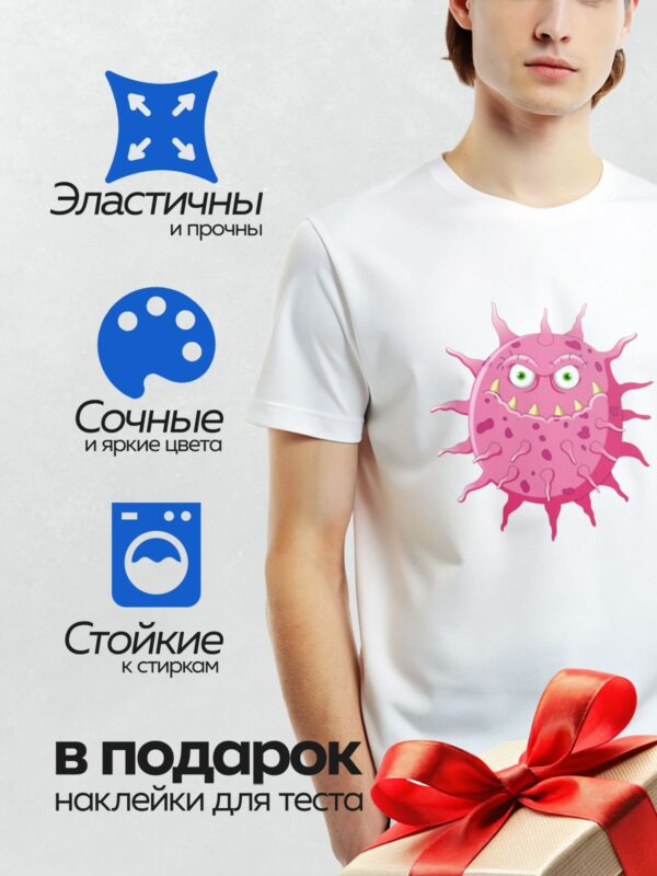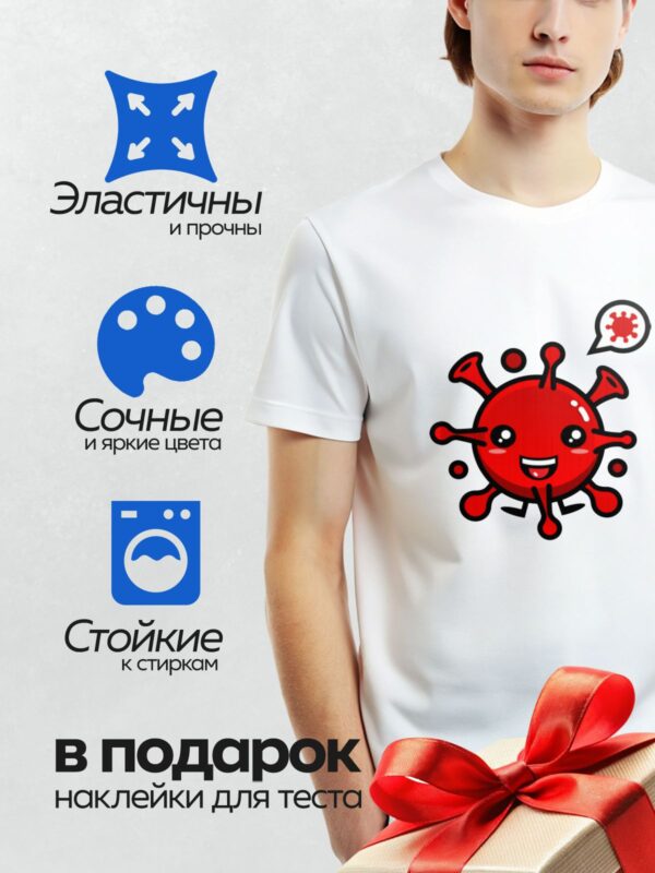 Термонаклейка на одежду DTF / Красный мультяшный вирус с улыбкой и мыслями о вирусах.