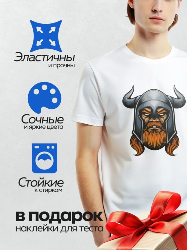Термонаклейка на одежду DTF / Могучий викинг с топорами и надписью “Viking”.