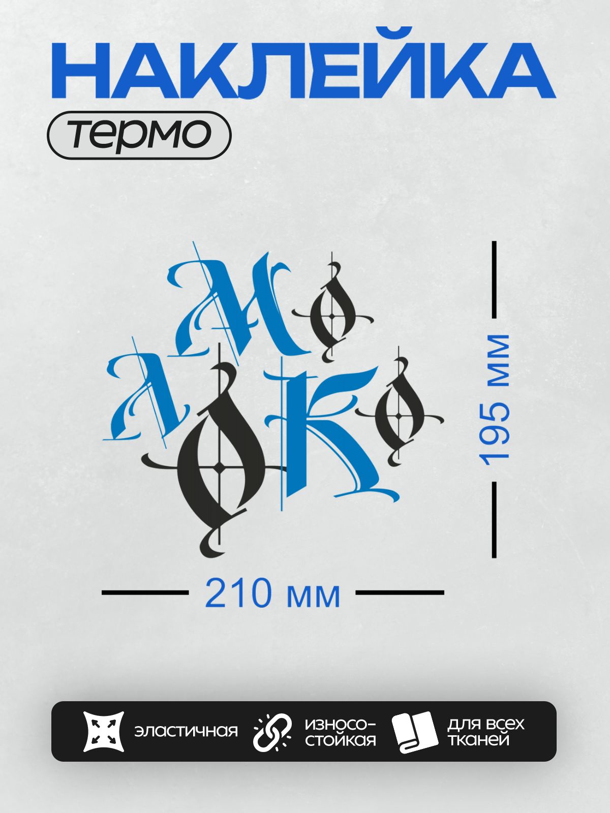 Термонаклейка на одежду DTF / Абстрактный узор из синих и черных букв на белом фоне.