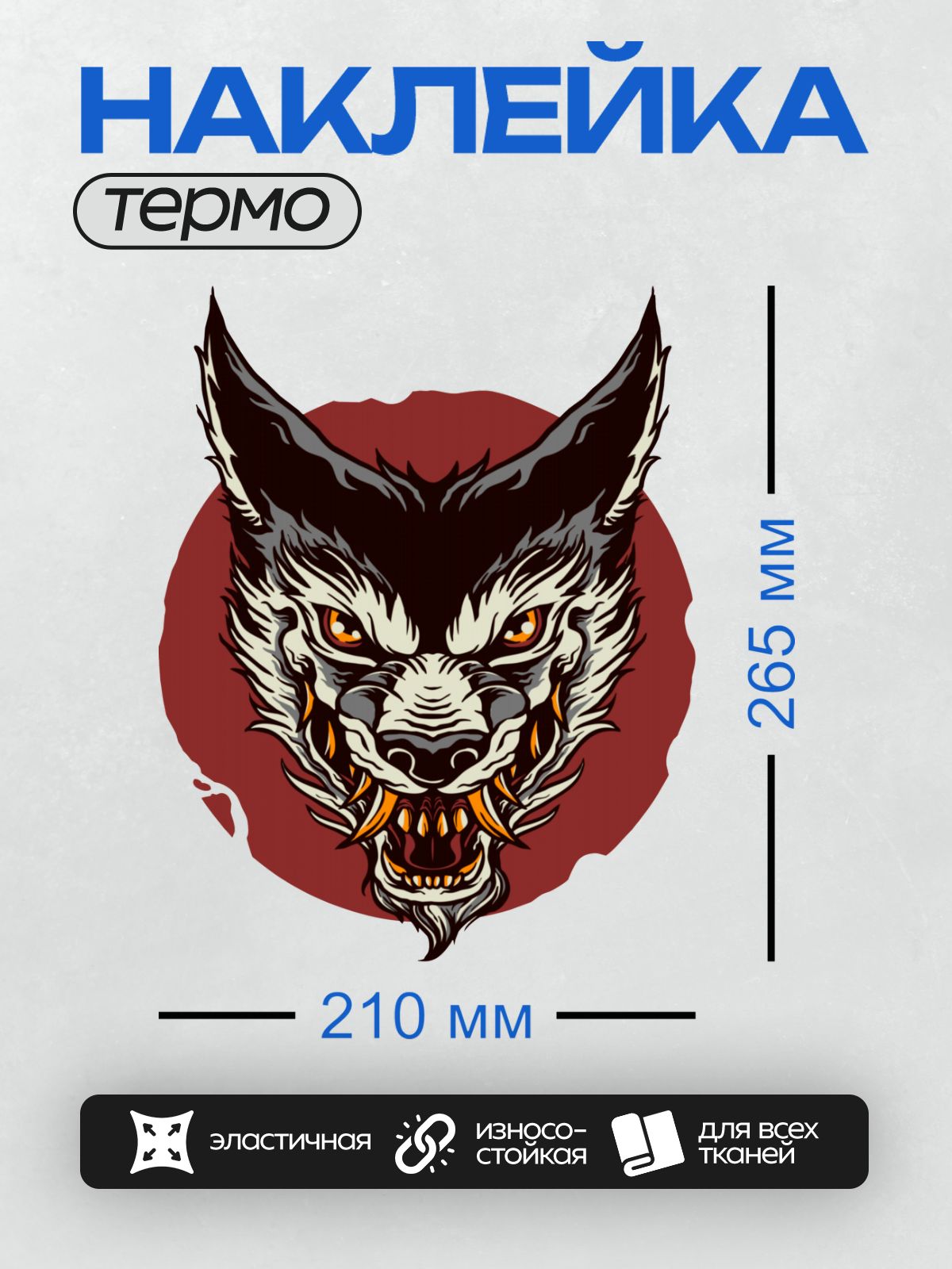 Дизайн: Агрессивный волк с оранжевыми глазами и острыми зубами. — идеально подходит для декора и восстановления одежды.