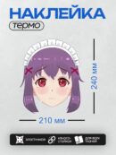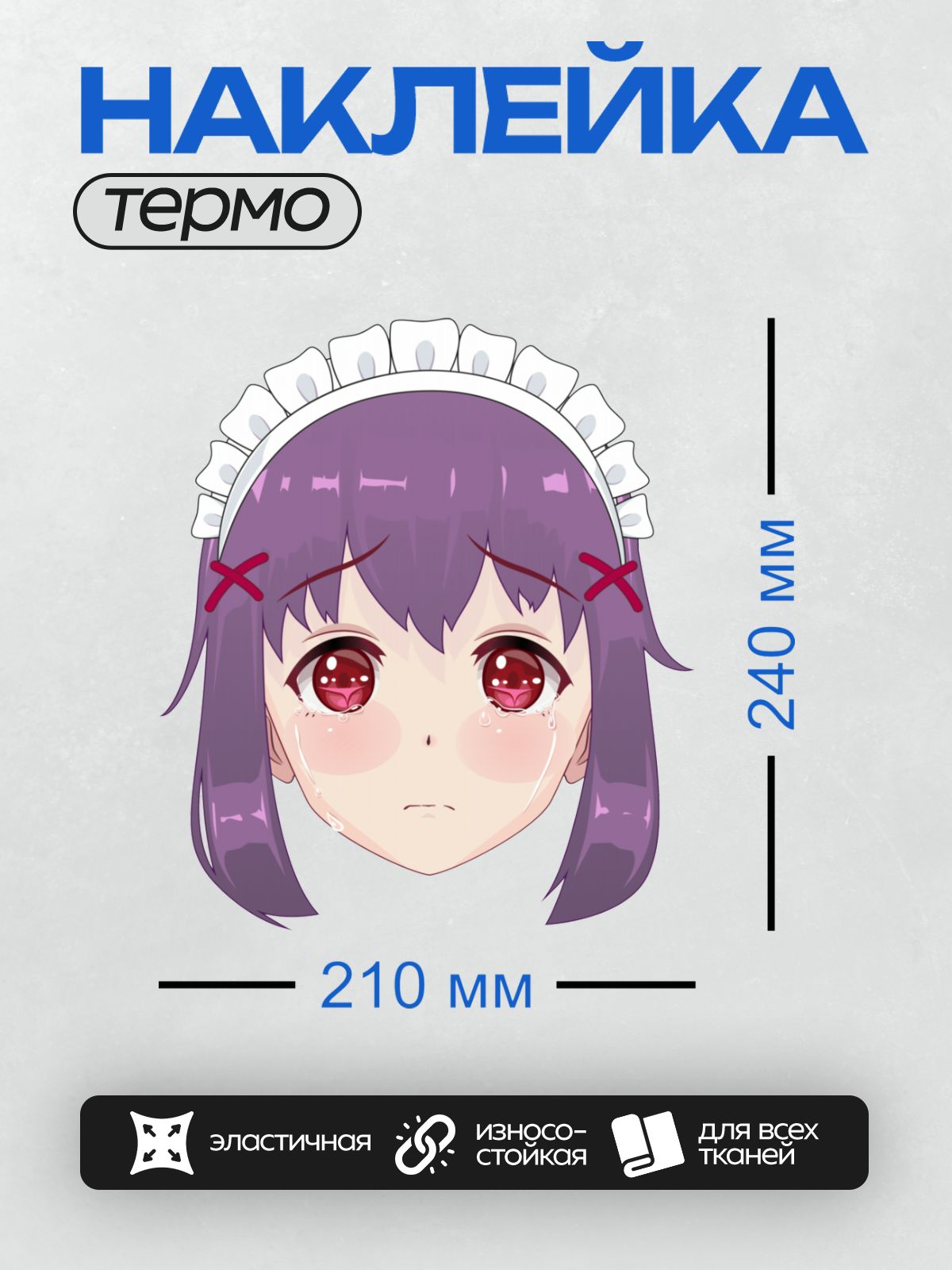 Дизайн: Аниме-девушка с фиолетовыми волосами, большими красными глазами, в белом чепчике горничной, с грустным выражением лица и слезами на глазах. — идеально подходит для декора и восстановления одежды.