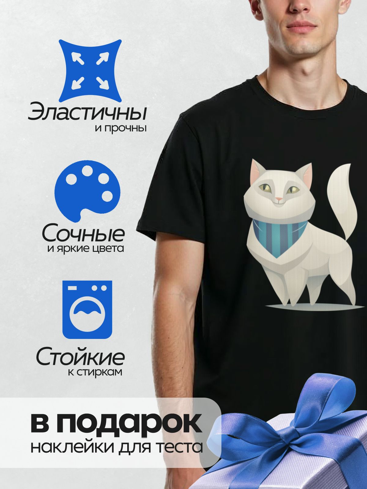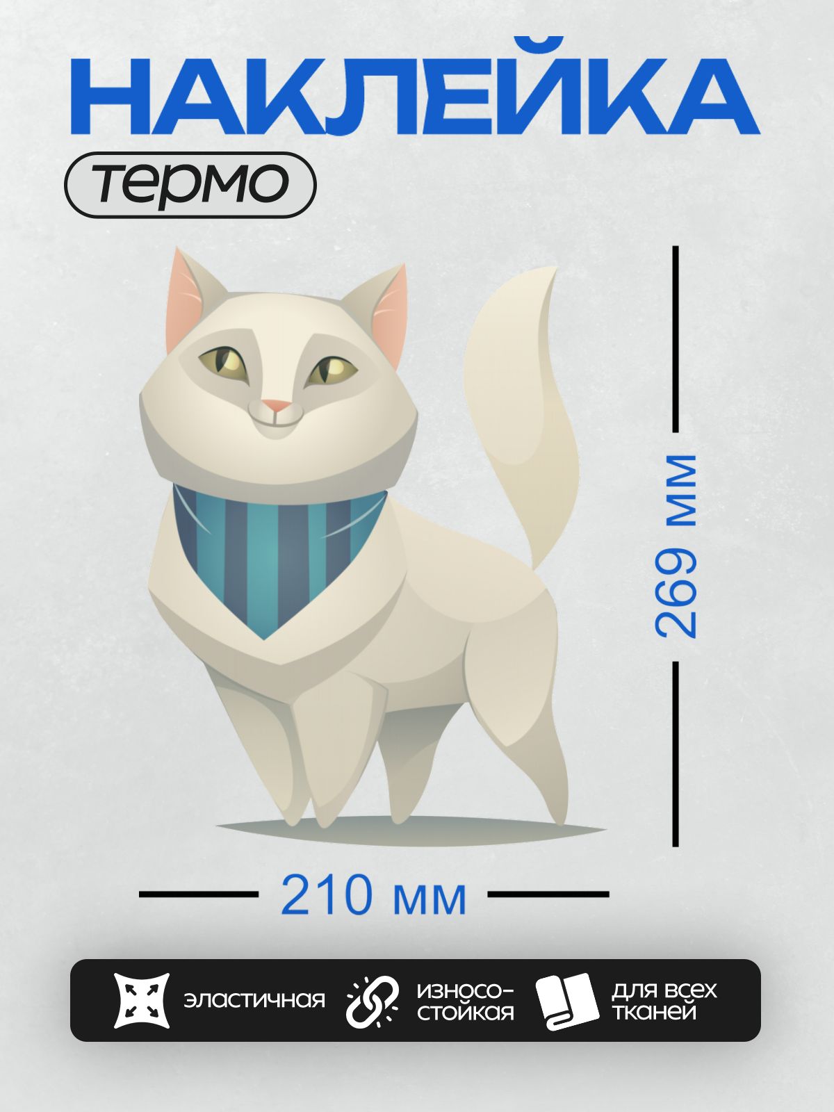 Дизайн: Белый мультяшный кот с синим шарфом. — идеально подходит для декора и восстановления одежды.