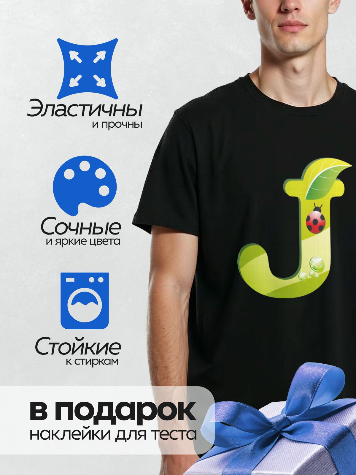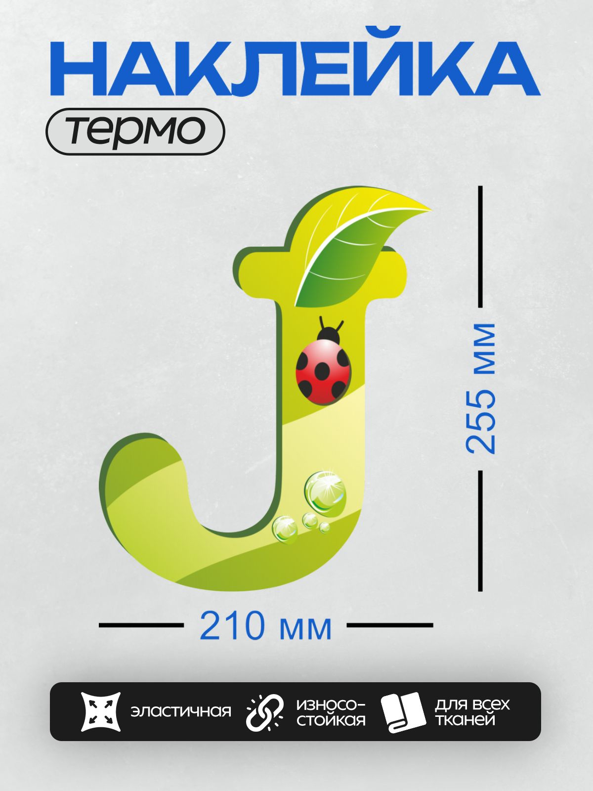 Дизайн: Буква “J” с божьей коровкой, листом и каплями воды. — идеально подходит для декора и восстановления одежды.