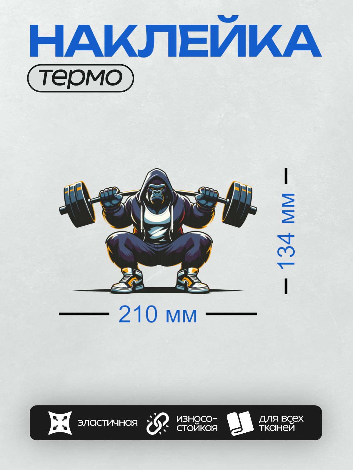 Дизайн: Горилла в худи делает приседания со штангой. — идеально подходит для декора и восстановления одежды.