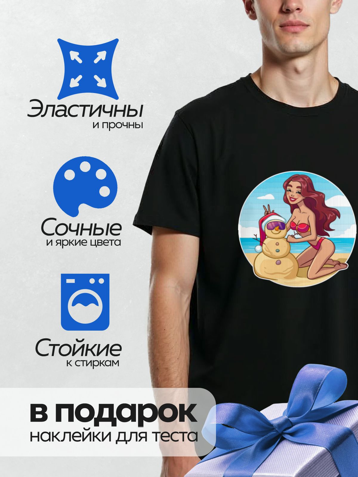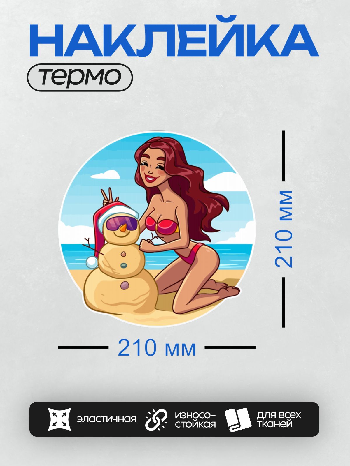 Термонаклейка на одежду DTF / Девушка в купальнике украшает песочного снеговика.