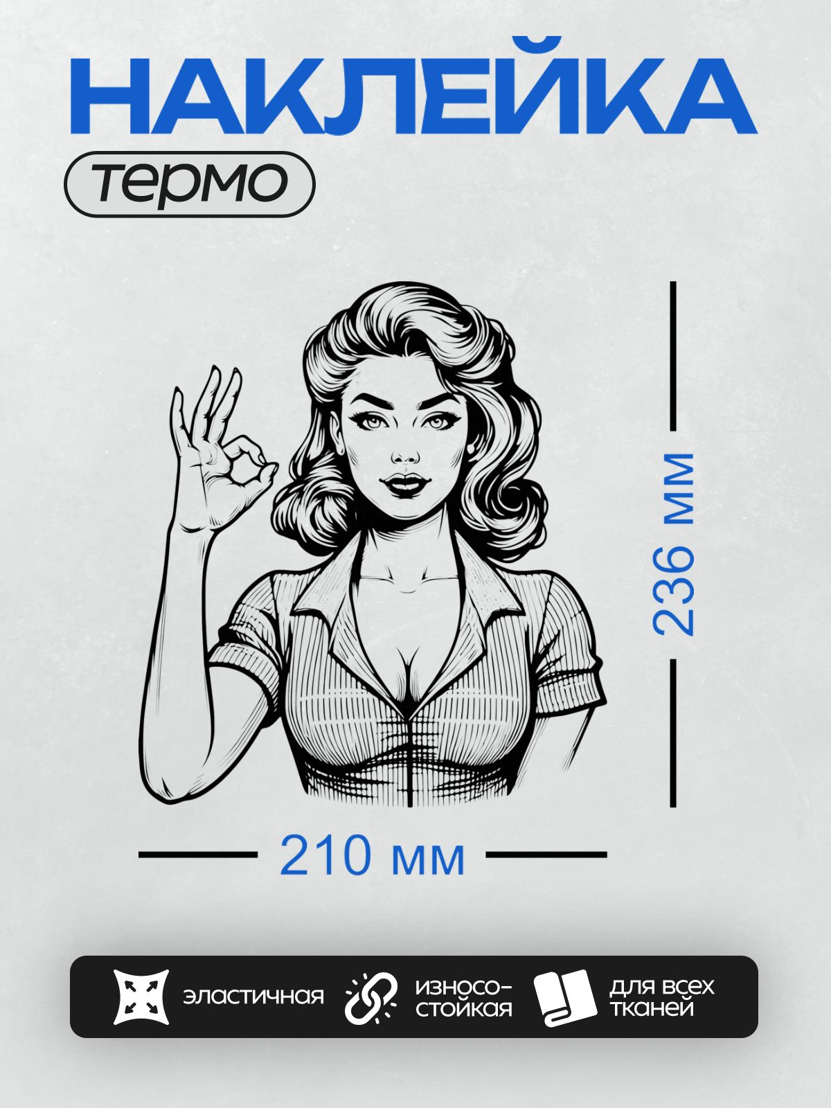 Термонаклейка на одежду DTF / Девушка в стиле пин-ап с волнистыми волосами, показывающая жест “ОК”.