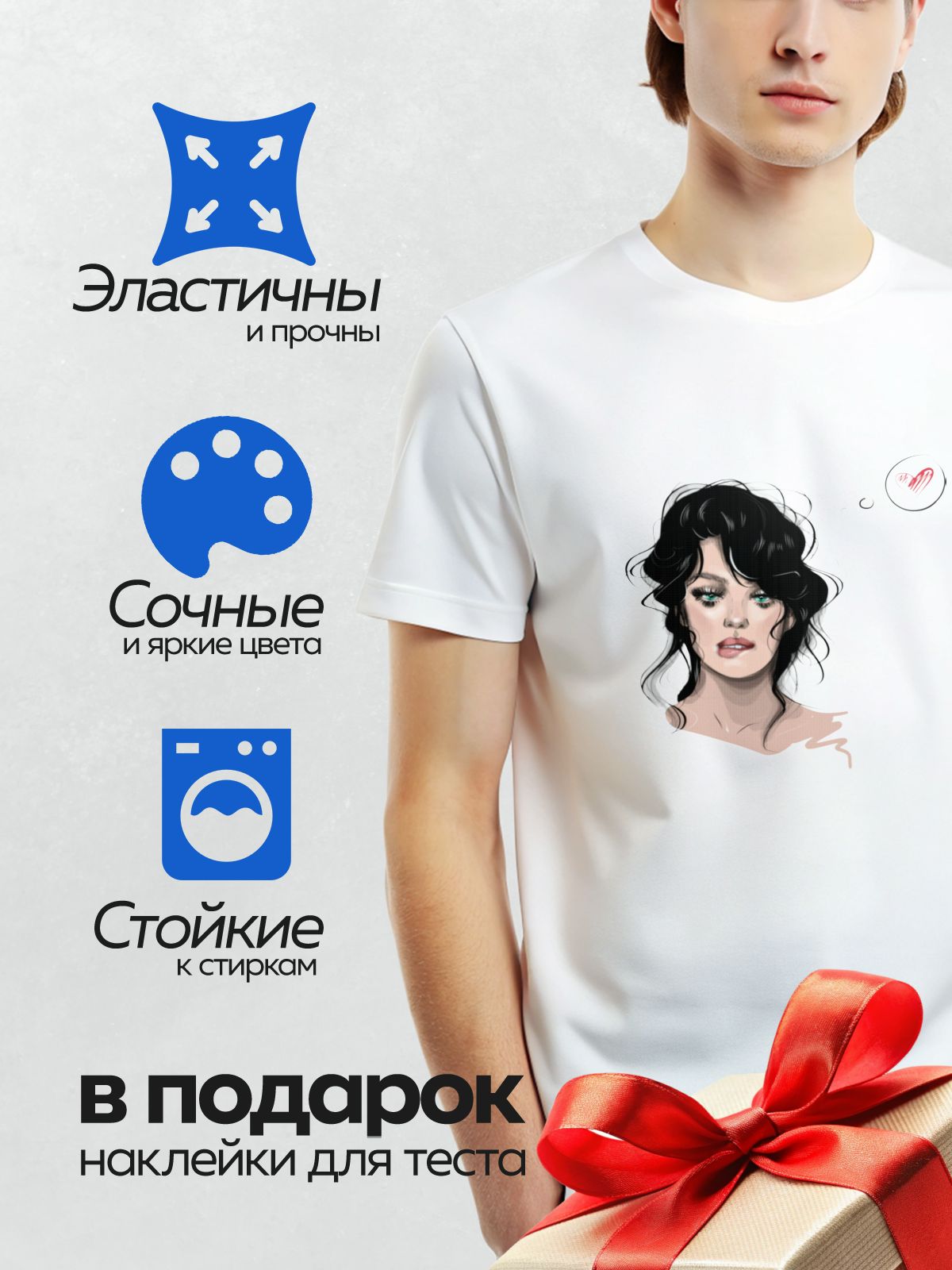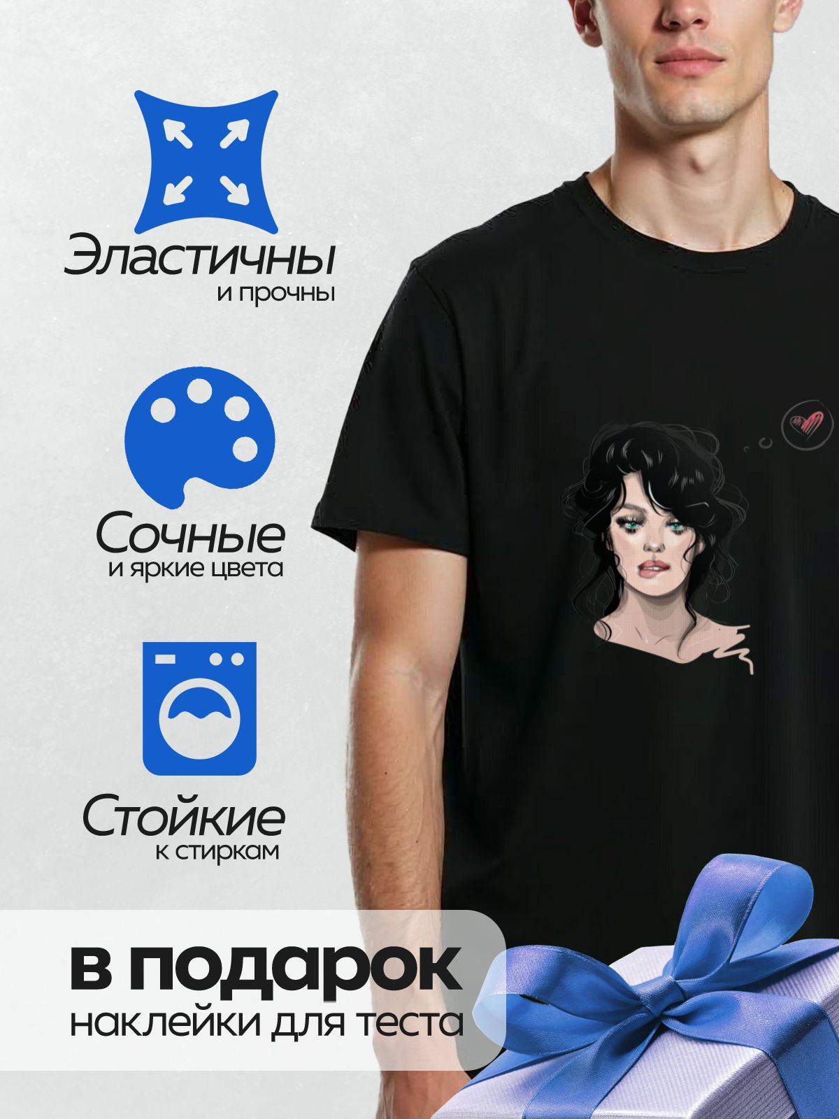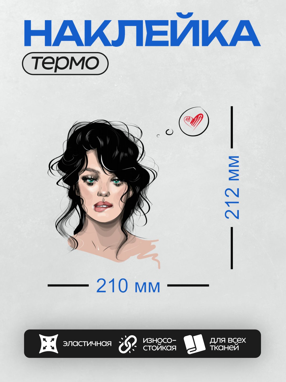 Термонаклейка на одежду DTF / Девушка с зелёными глазами, чёрными волосами и красным сердцем в облачке мысли.