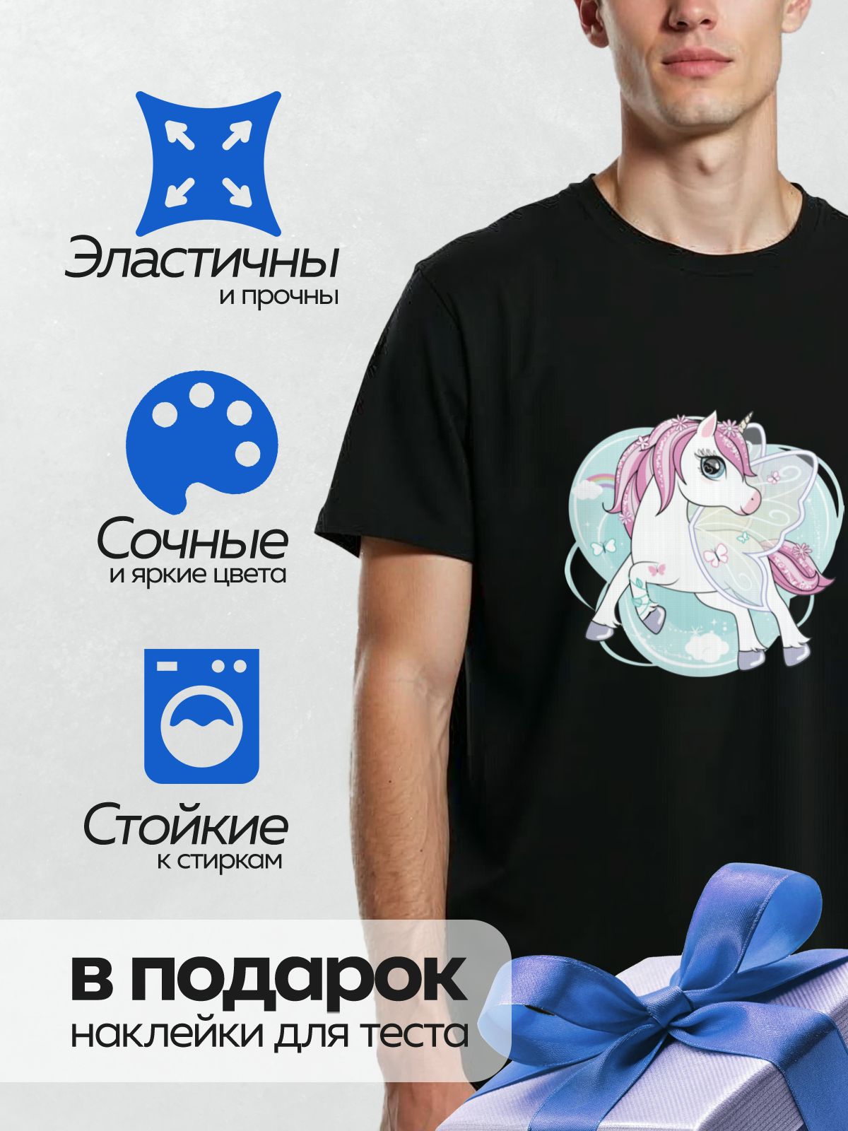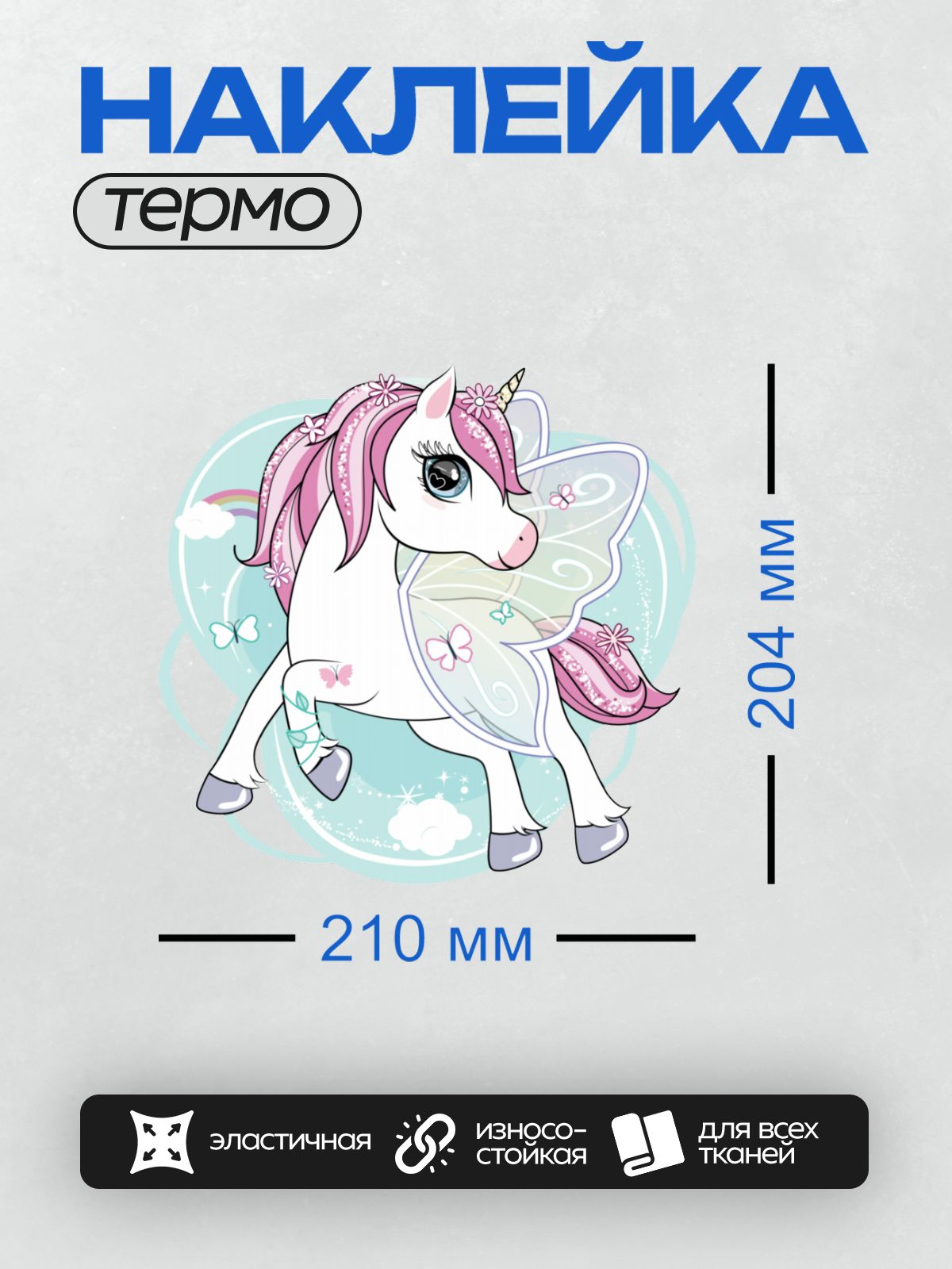 Термонаклейка на одежду DTF / Единорог с крыльями бабочки, розовой гривой и цветами.