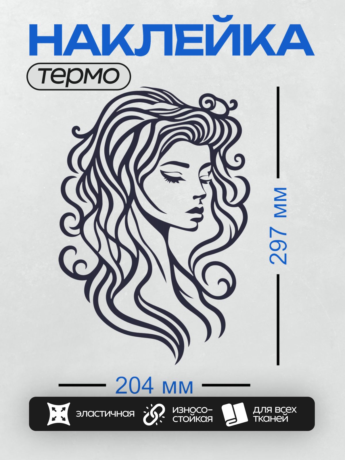 Дизайн: Женский профиль с длинными волнистыми волосами, черно-белый стиль. — идеально подходит для декора и восстановления одежды.