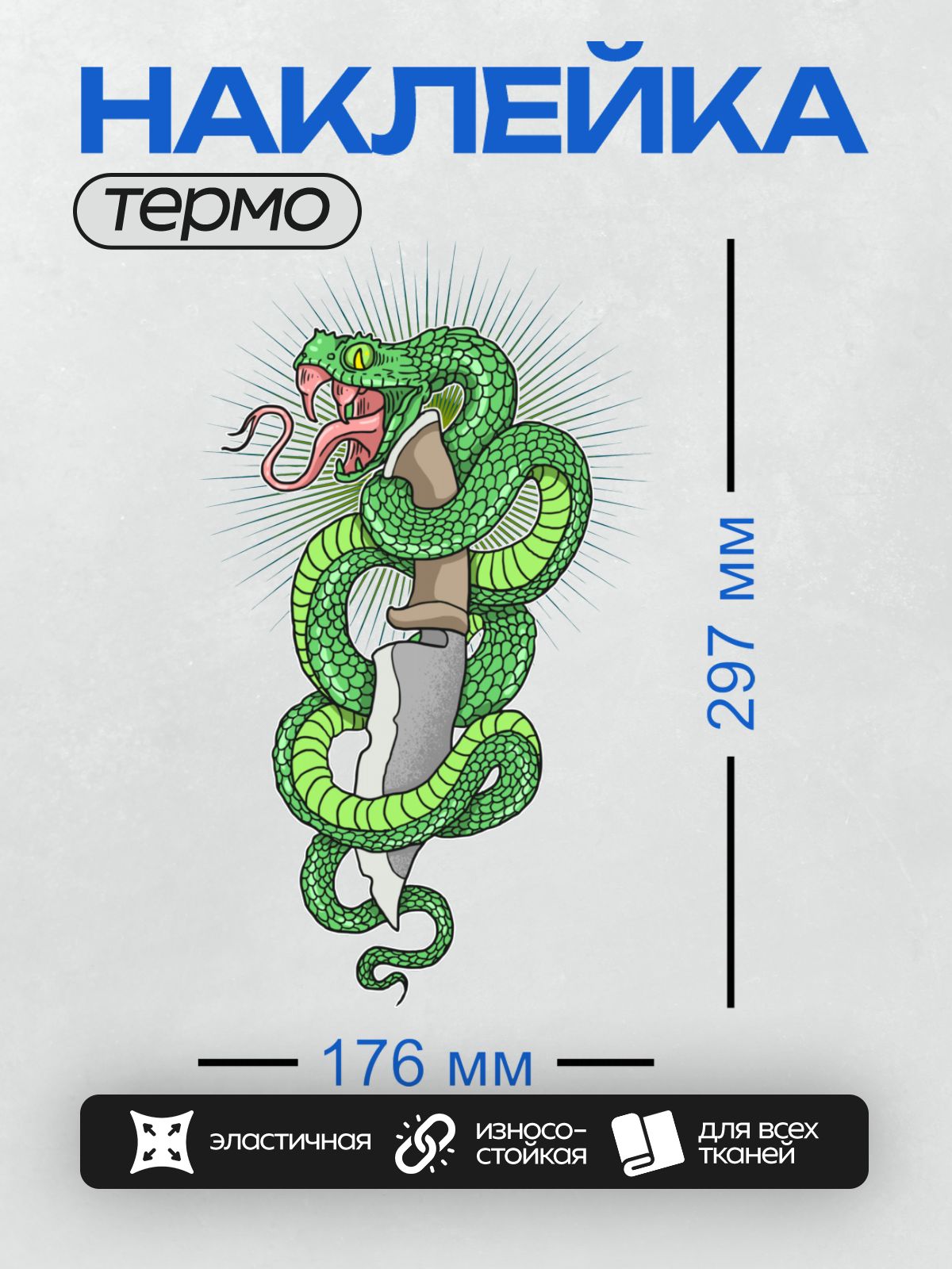 Дизайн: Зеленая змея с открытой пастью обвивает кинжал. — идеально подходит для декора и восстановления одежды.