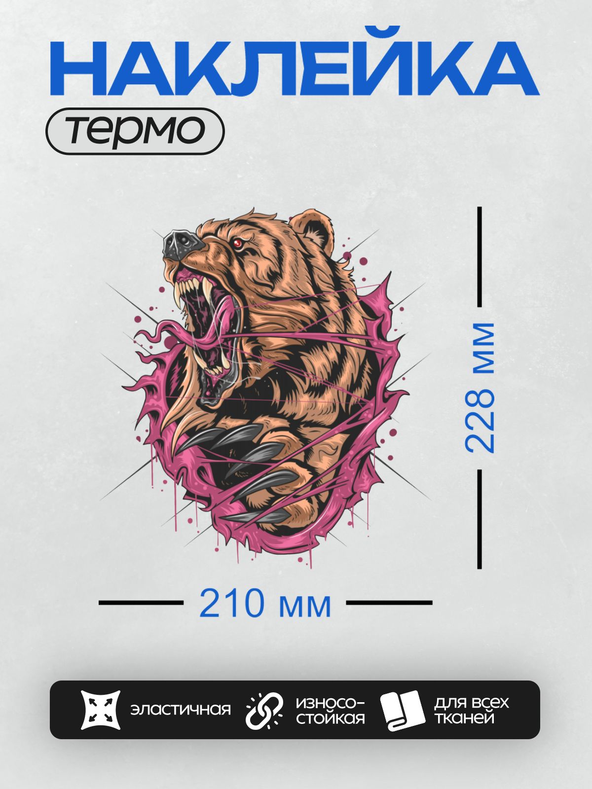 Дизайн: Злой медведь с оскалом и когтями, окружённый розовыми линиями. — идеально подходит для декора и восстановления одежды.