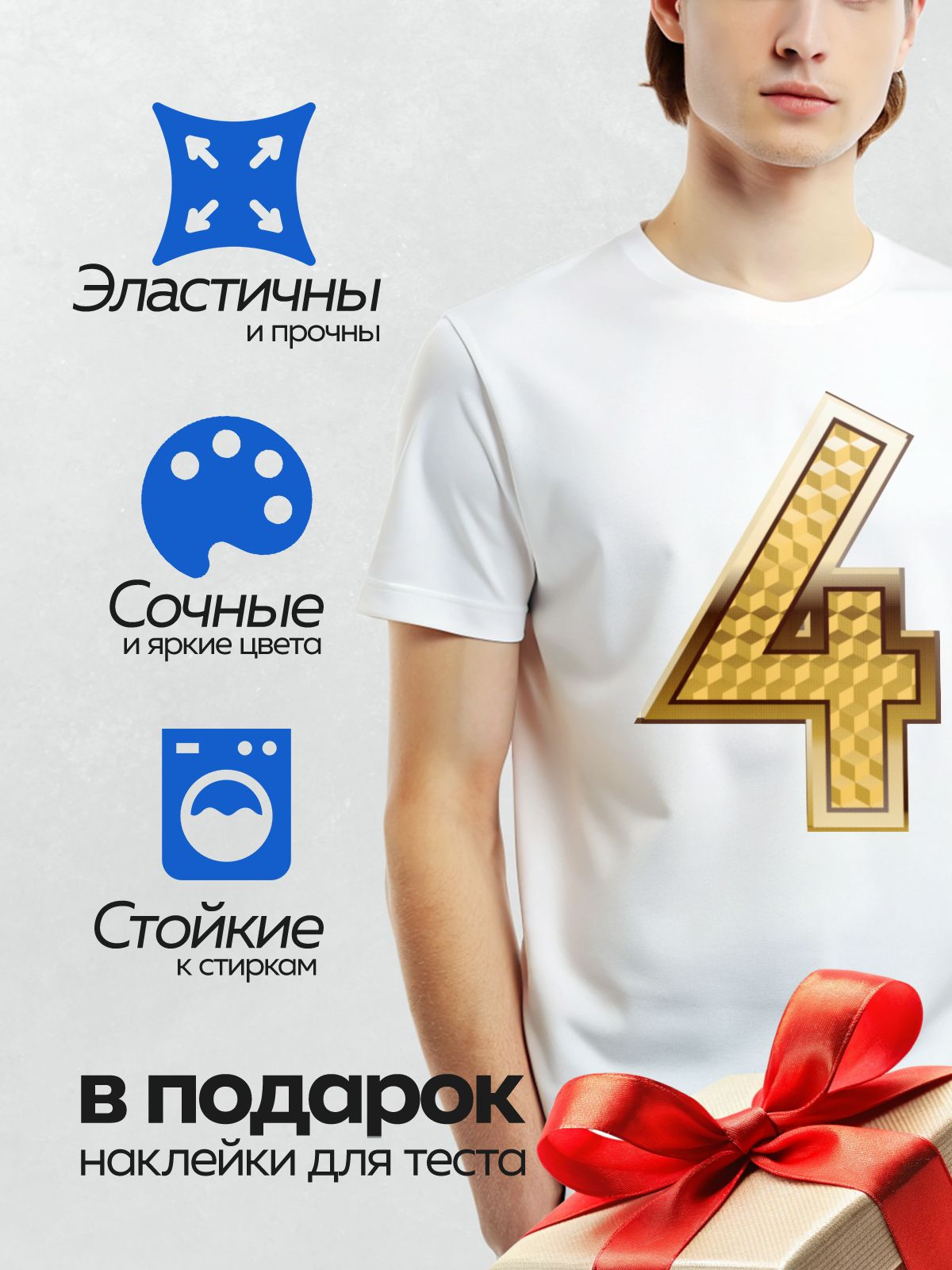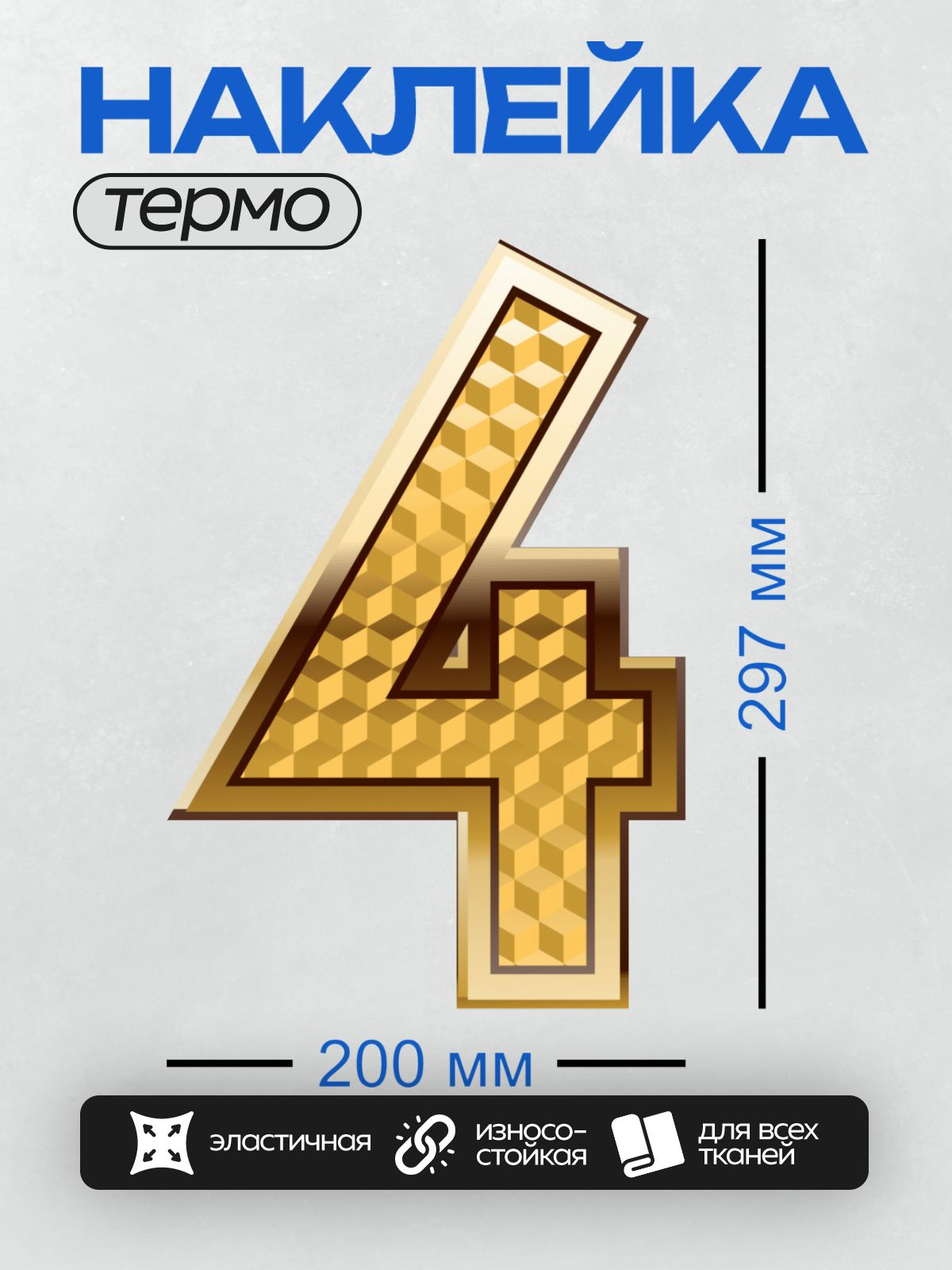 Термонаклейка на одежду DTF / Золотая цифра 4 с узором в виде шахматной доски.