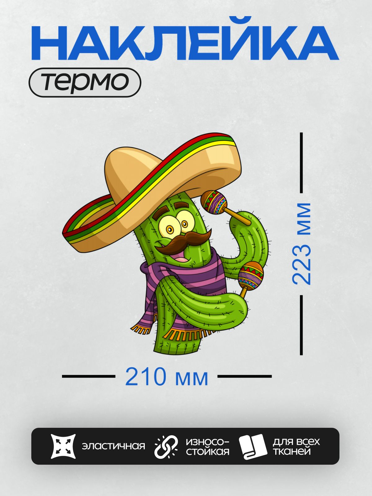 Дизайн: Кактус в сомбреро, с усами и маракасами. — идеально подходит для декора и восстановления одежды.