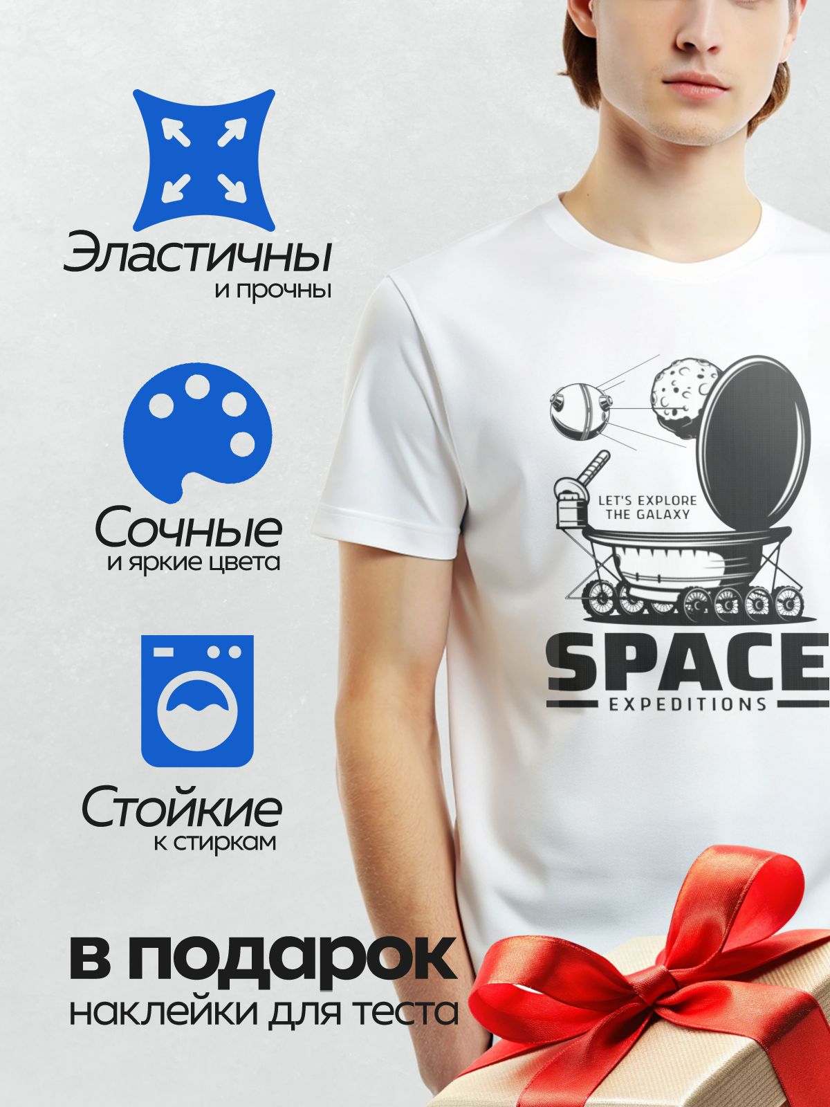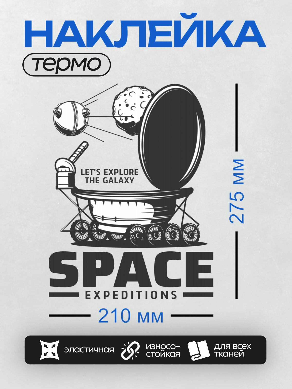 Дизайн: Логотип с космическим аппаратом, планетой и текстом о галактических экспедициях. — идеально подходит для декора и восстановления одежды.