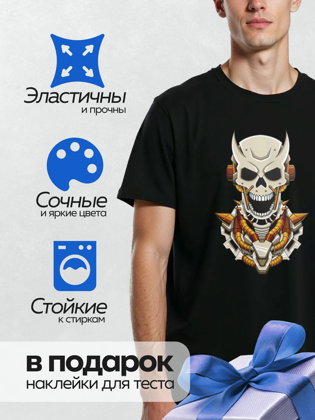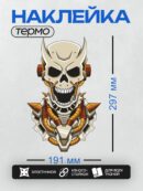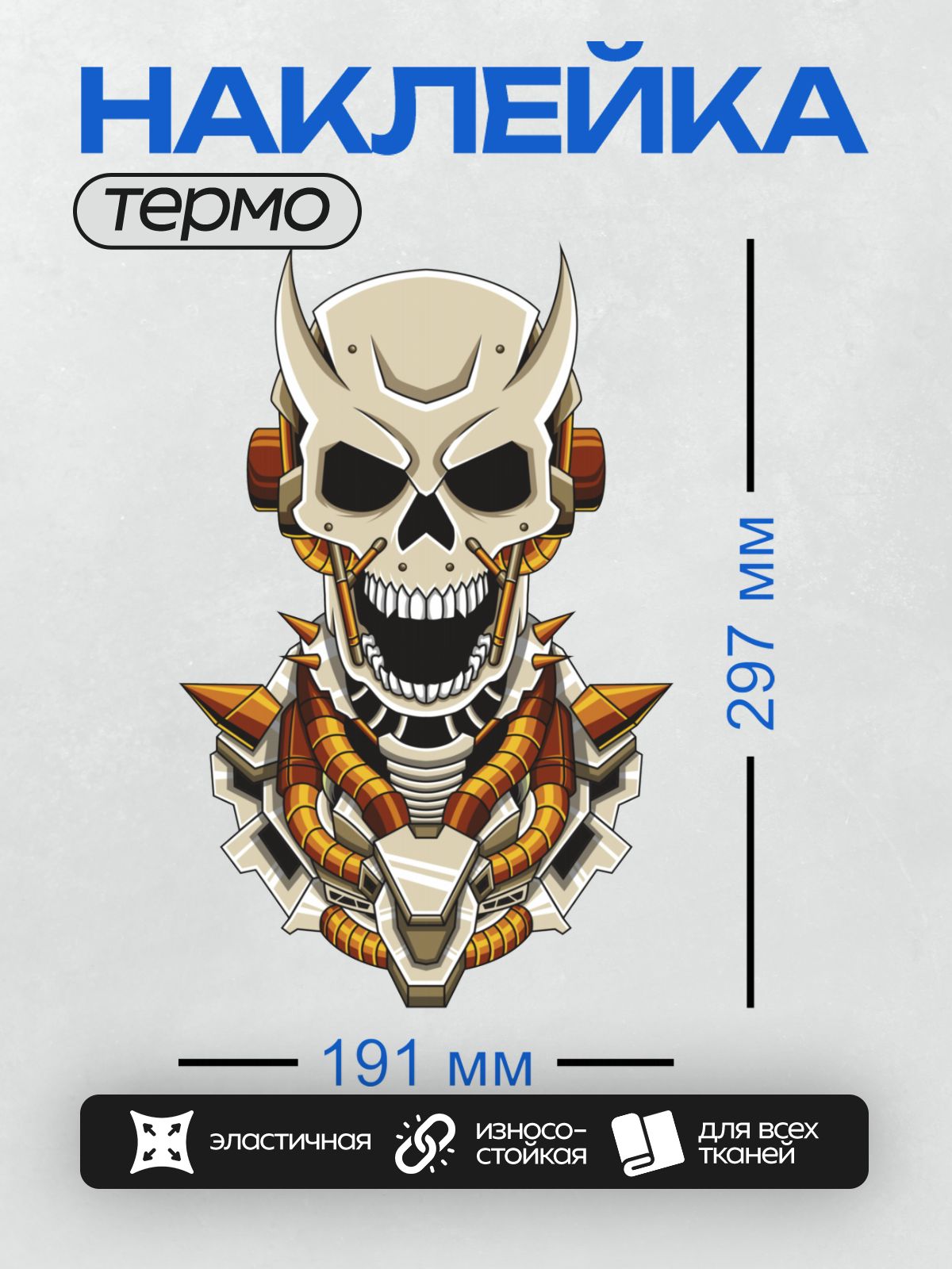 Термонаклейка на одежду DTF / Механический череп с рогами и оранжевыми деталями.