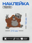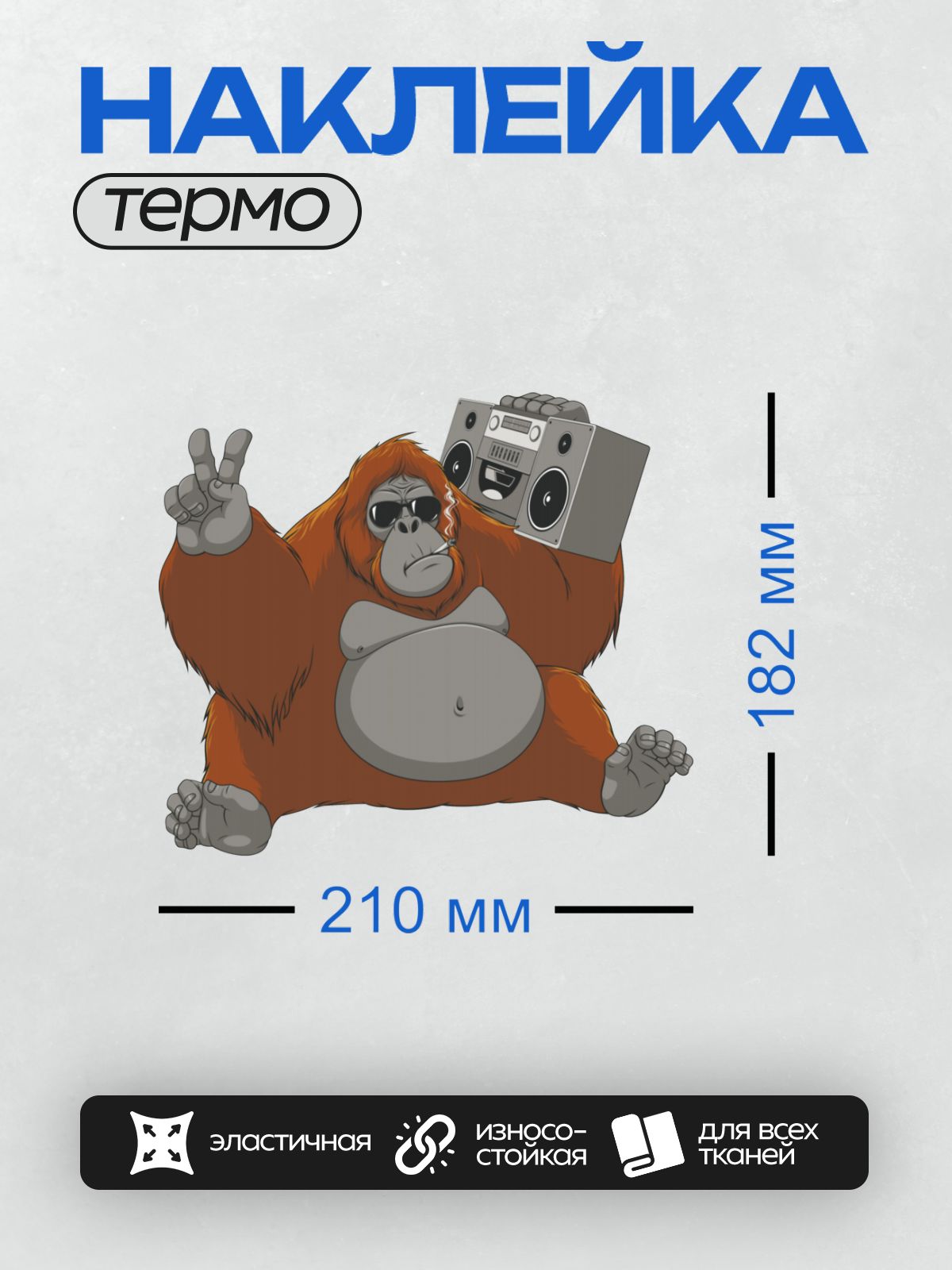 Термонаклейка на одежду DTF / Мультяшный орангутан с бумбоксом и жестом мира.
