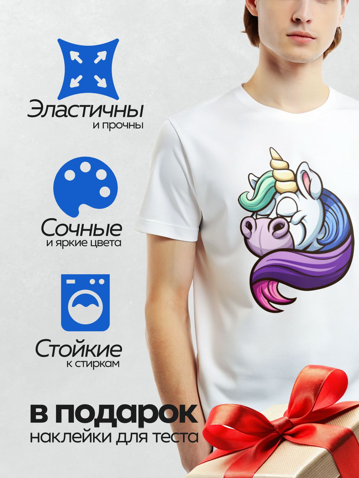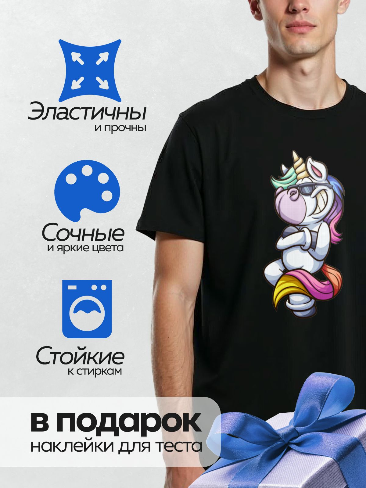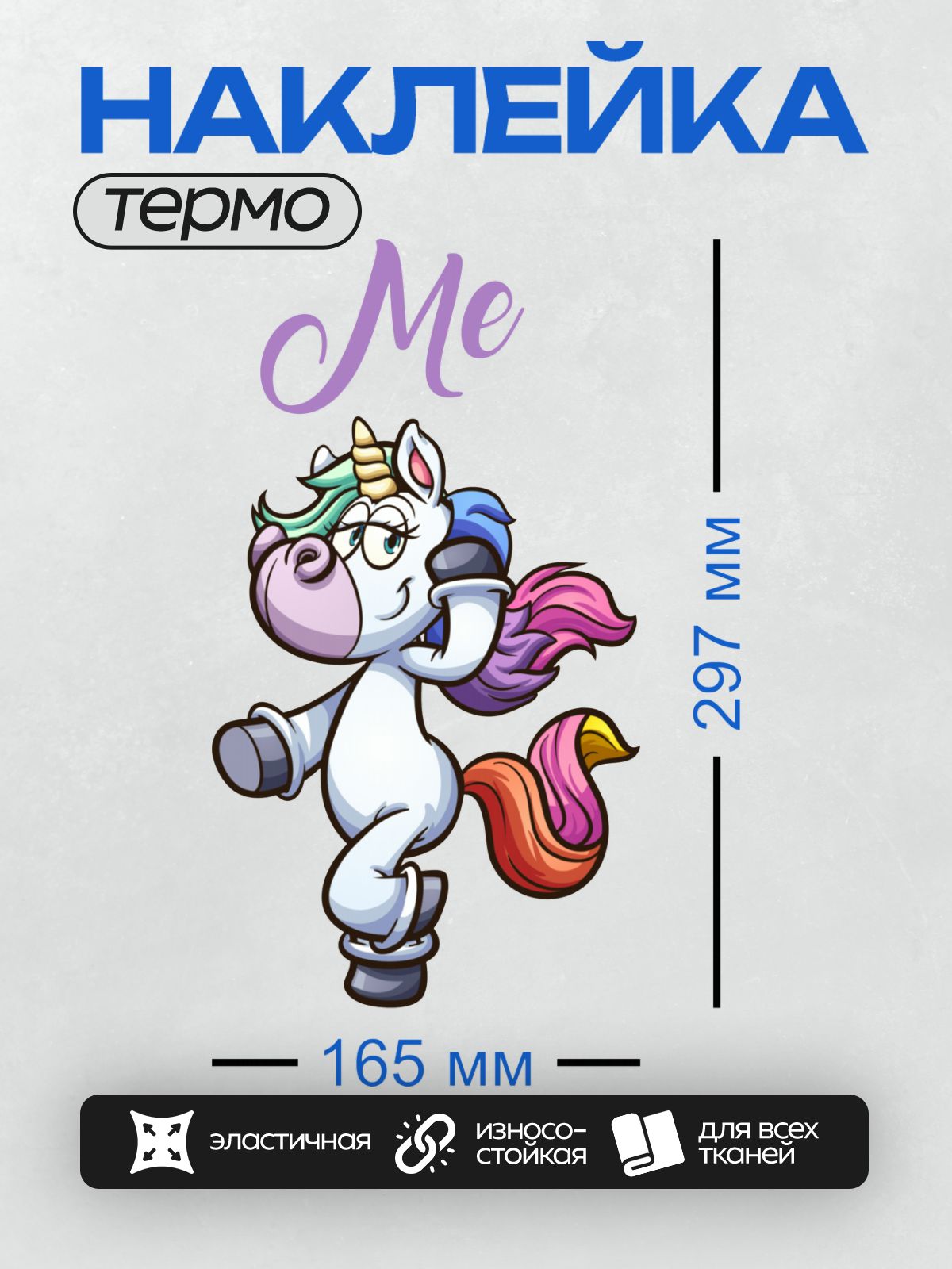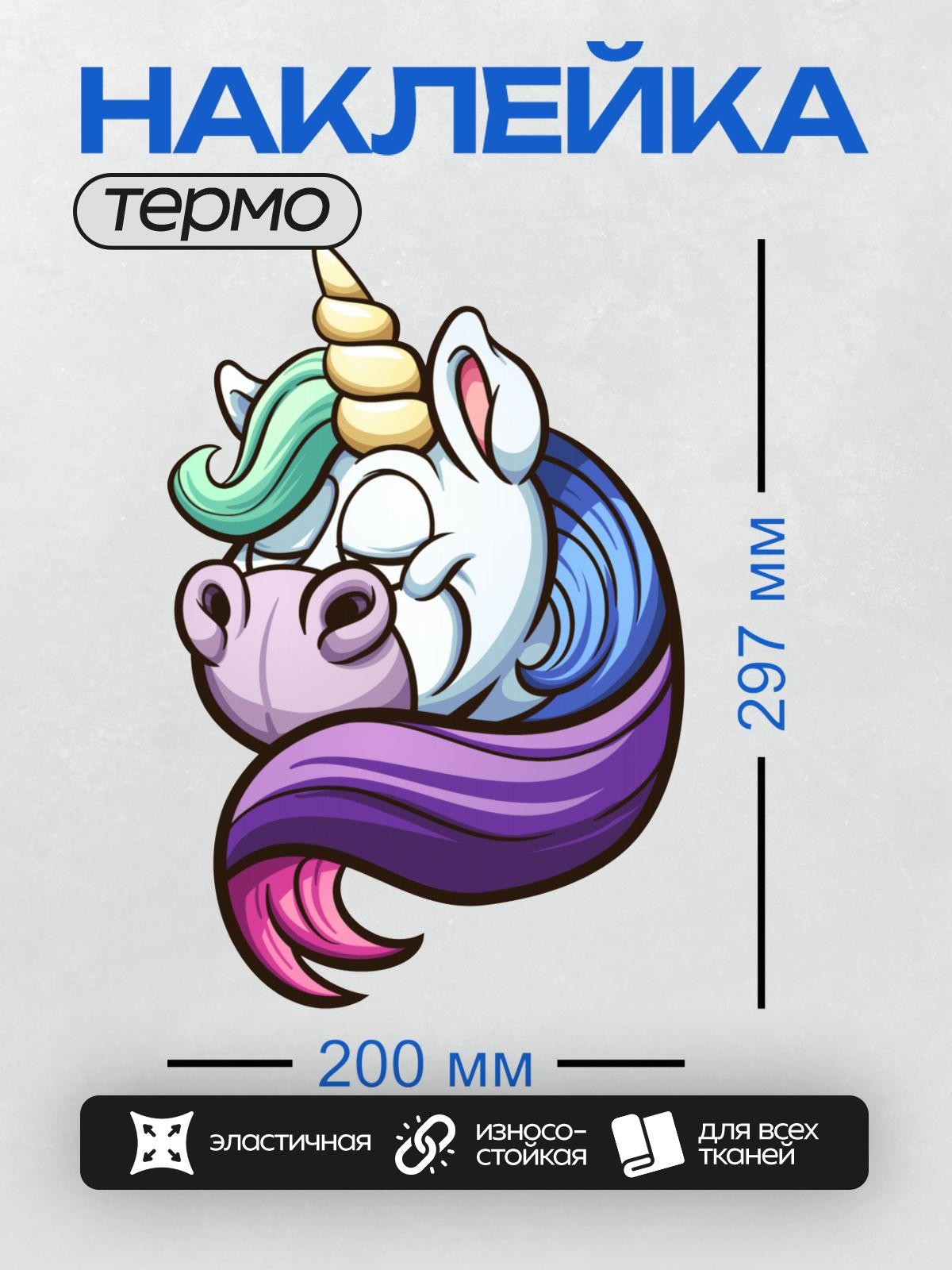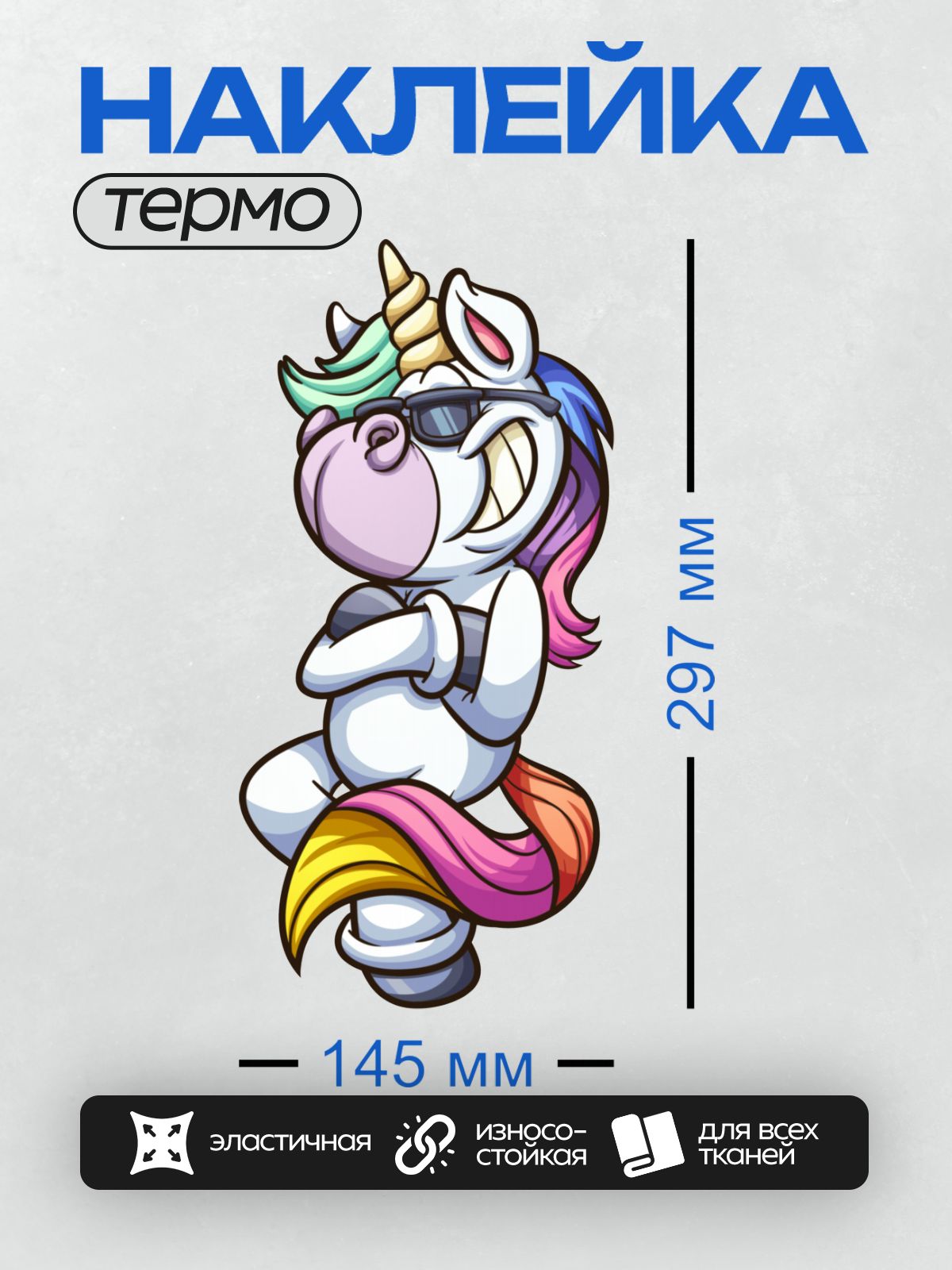 Дизайн: Мультяшный единорог в очках с радужной гривой. — идеально подходит для декора и восстановления одежды.