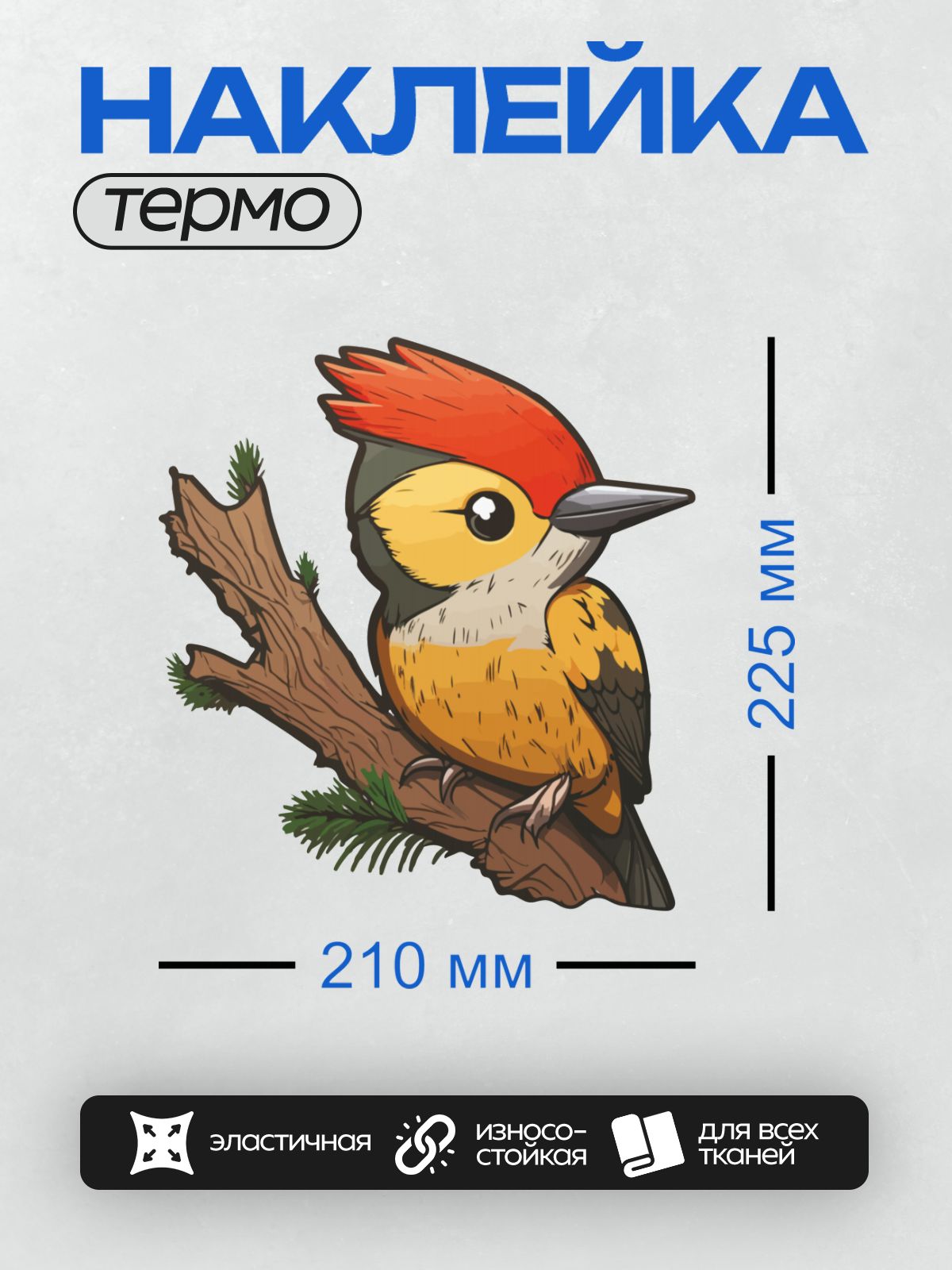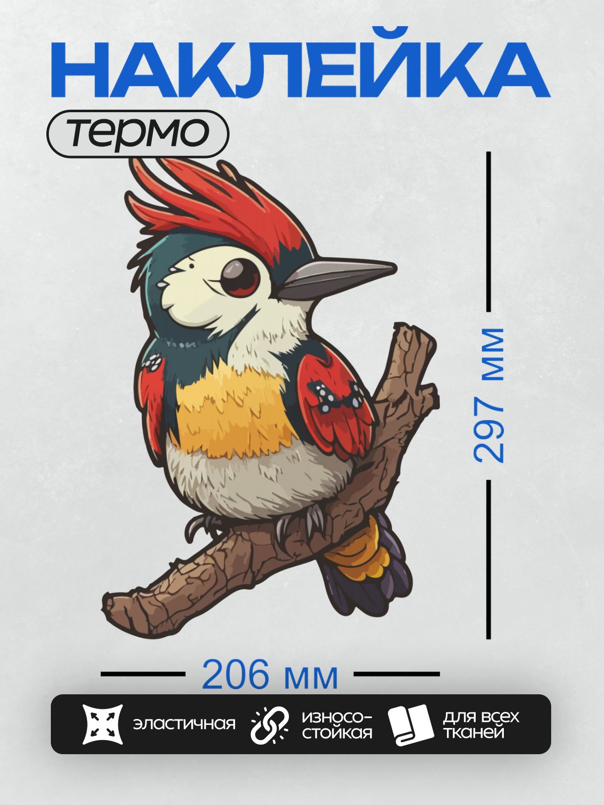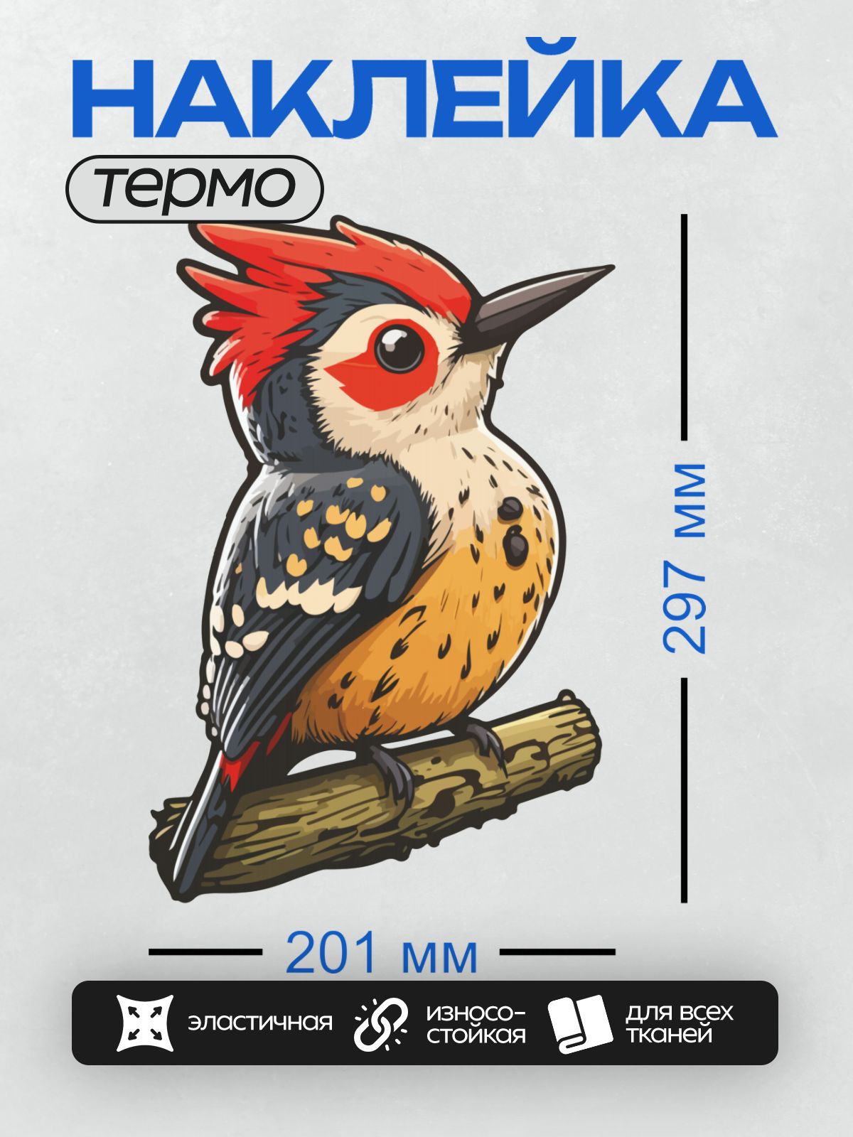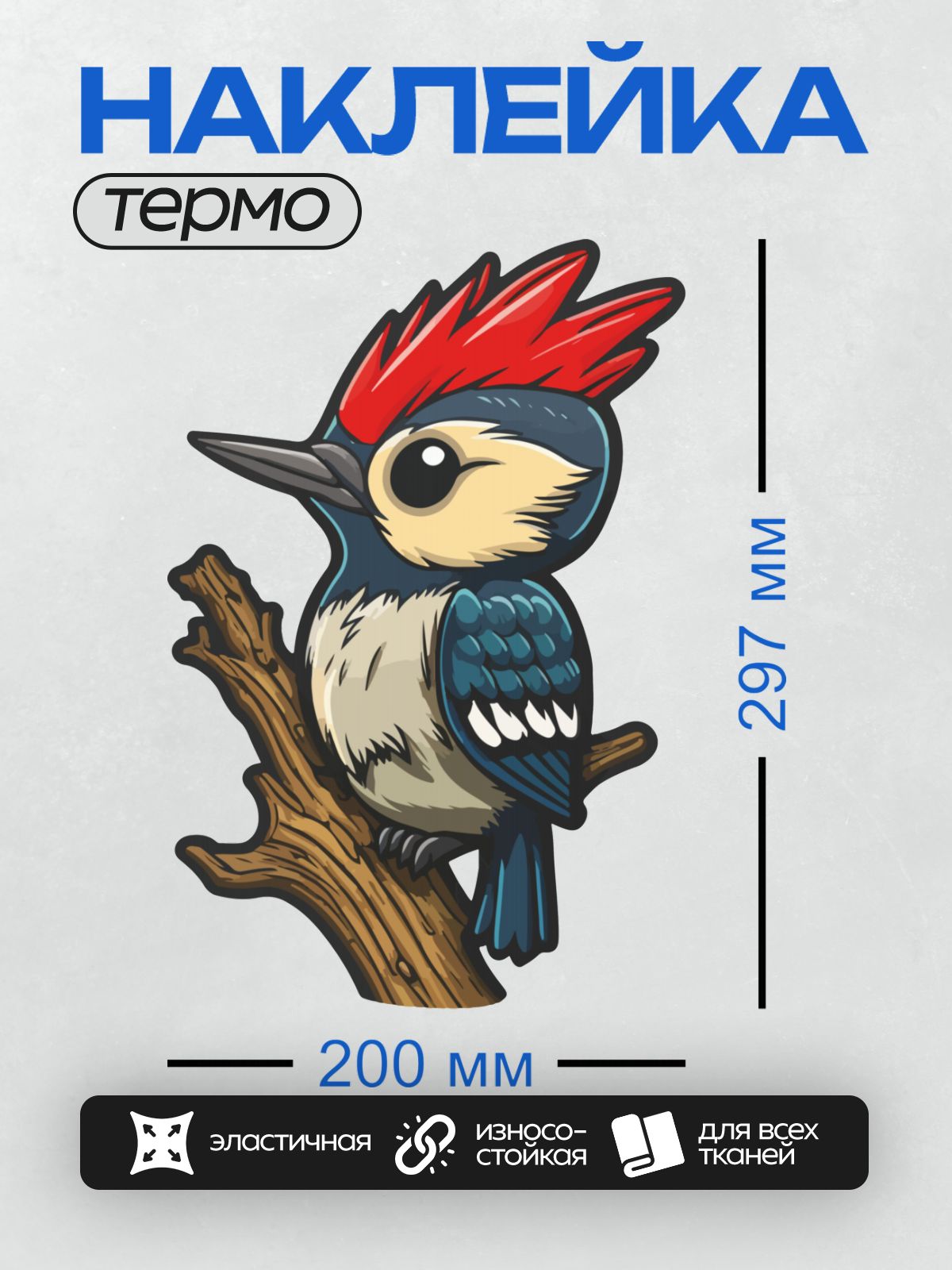 Дизайн: Мультяшный дятел с красным хохолком на ветке. — идеально подходит для декора и восстановления одежды.