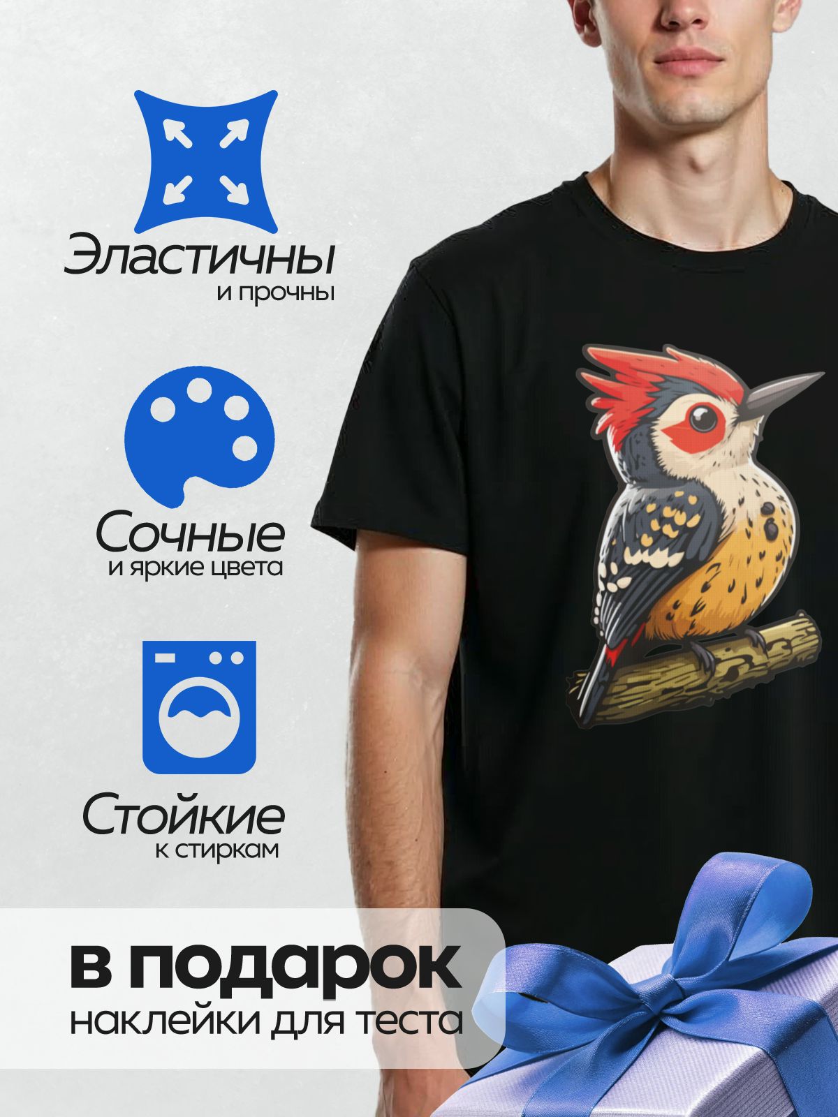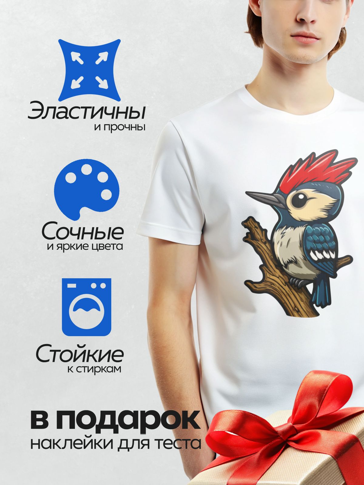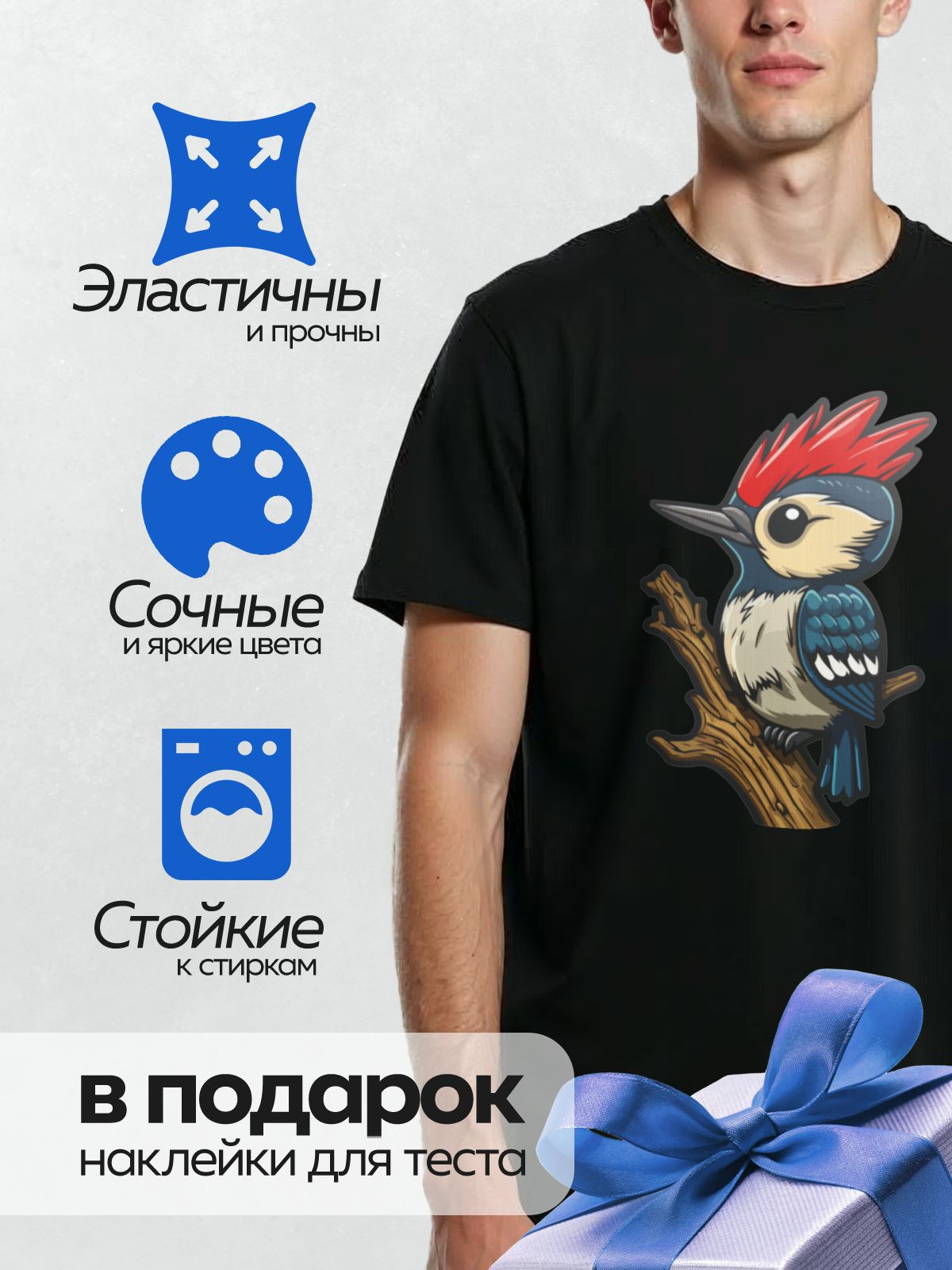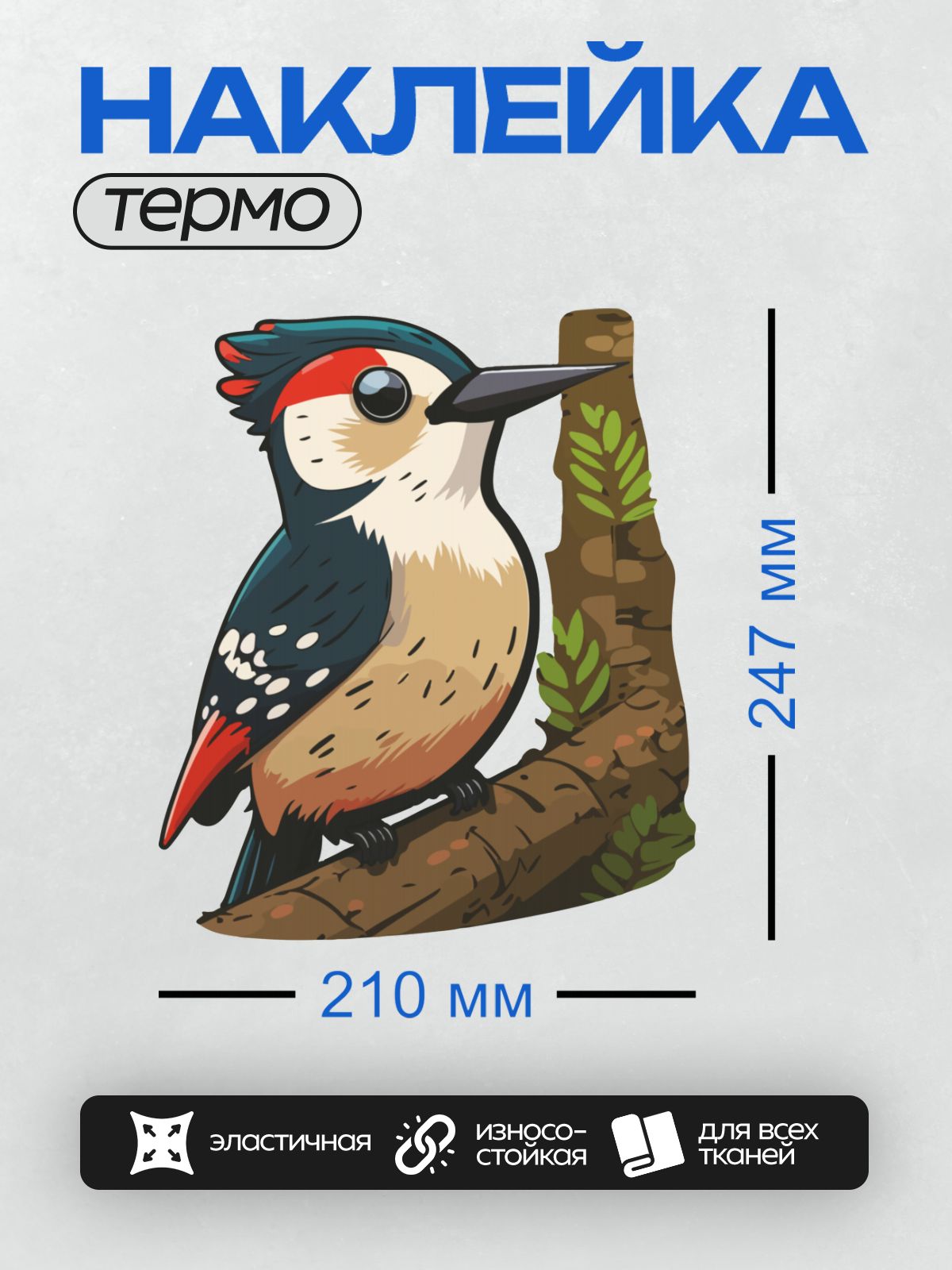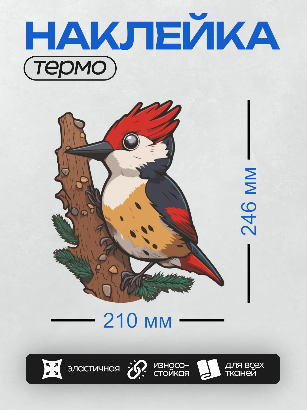 Дизайн: Мультяшный дятел с красным хохолком на ветке. — идеально подходит для декора и восстановления одежды.