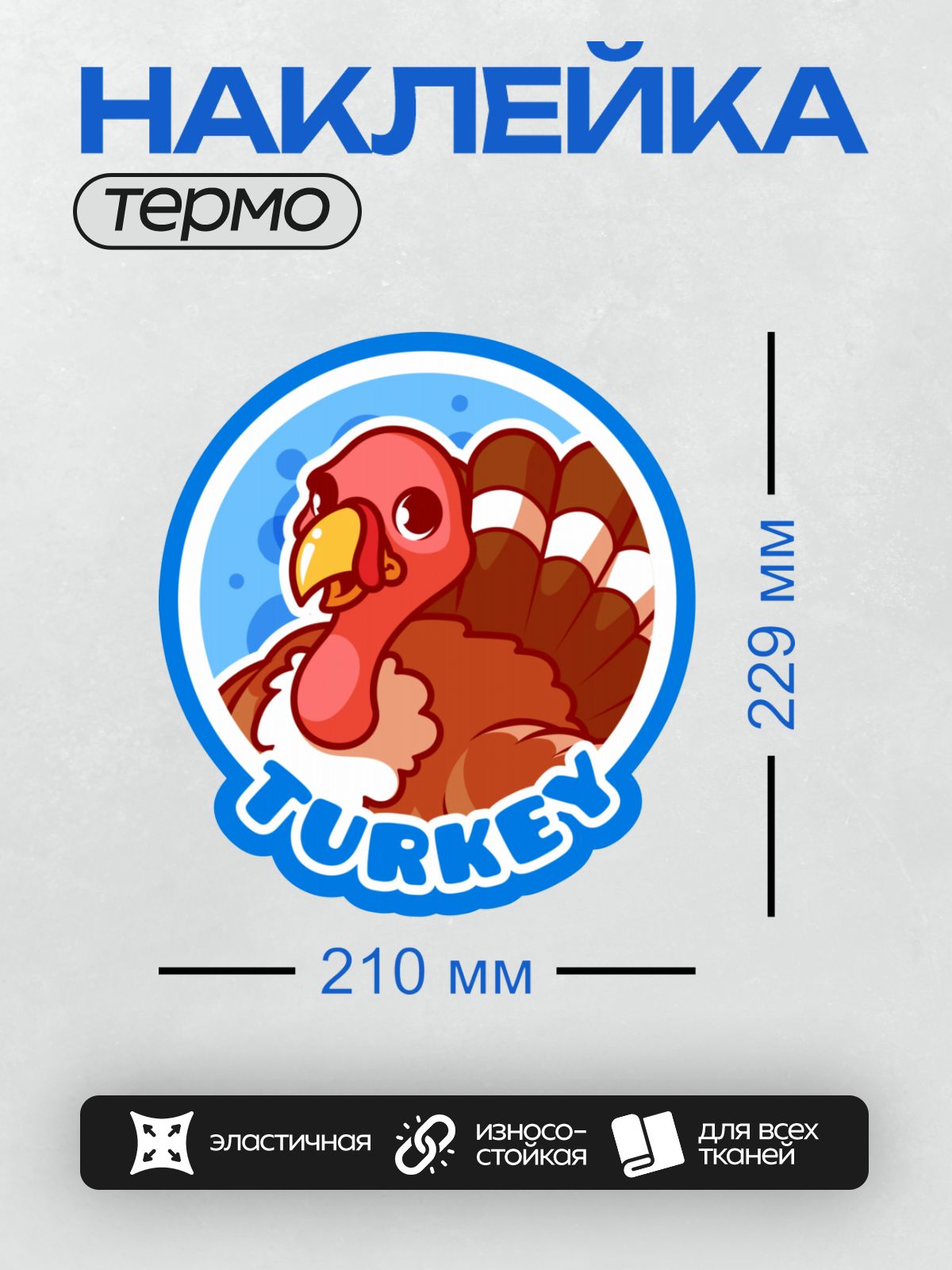 Термонаклейка на одежду DTF / Мультяшный индюк с надписью “Turkey” на синем фоне.