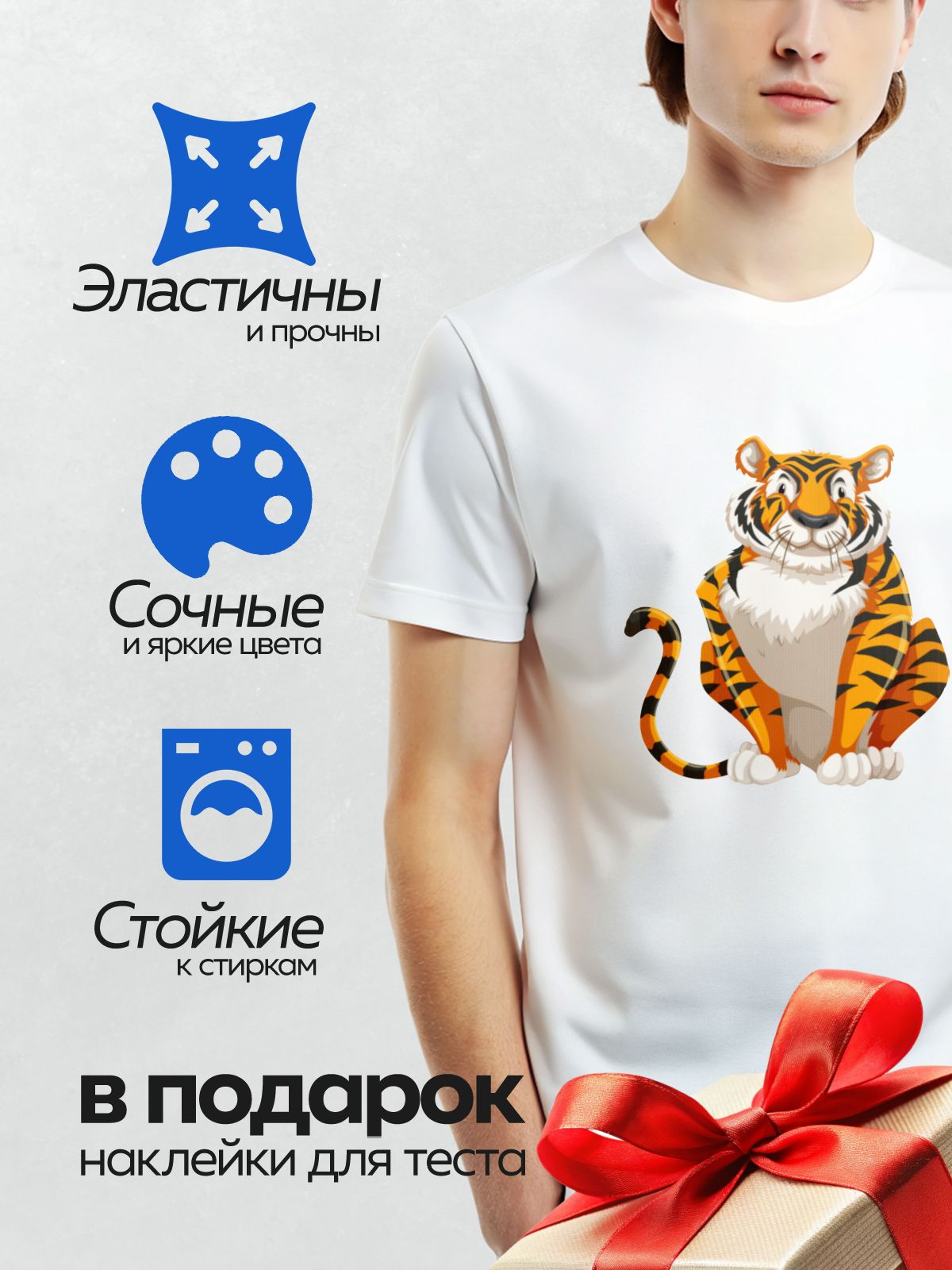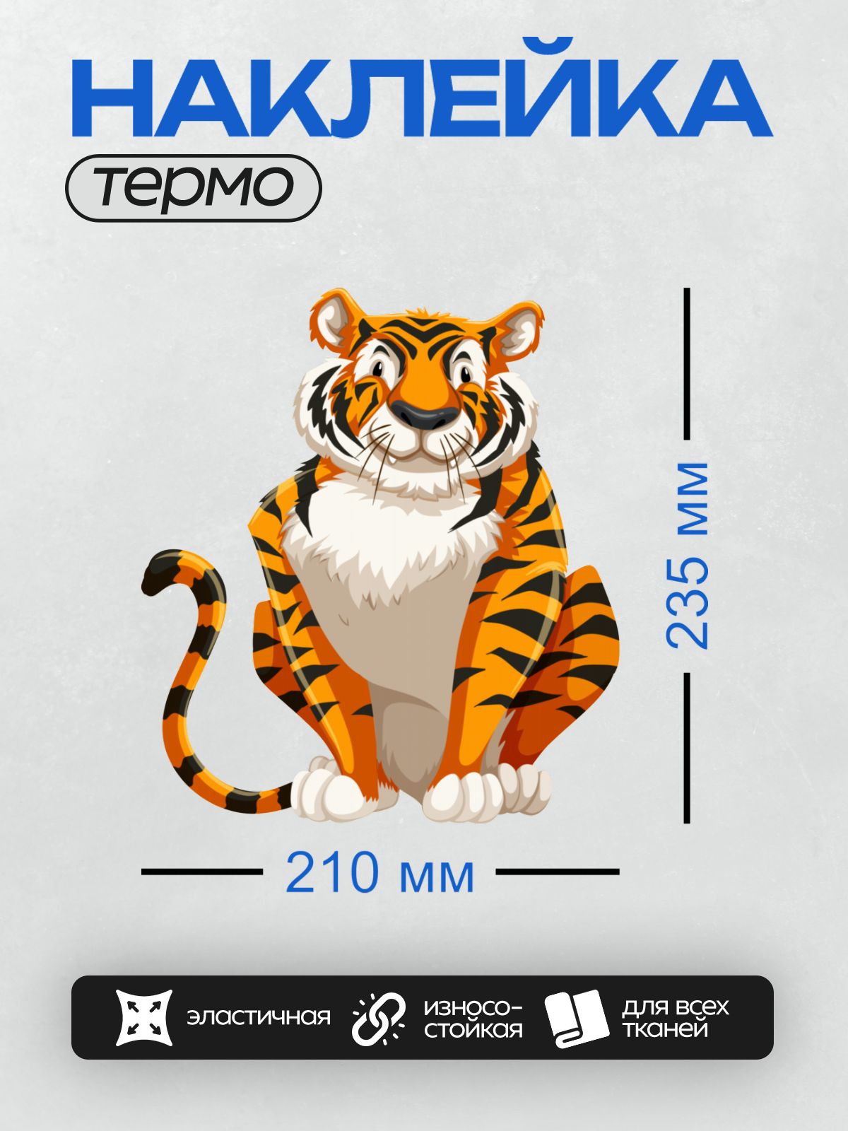 Дизайн: Мультяшный тигр с яркими полосками, сидит и улыбается. — идеально подходит для декора и восстановления одежды.
